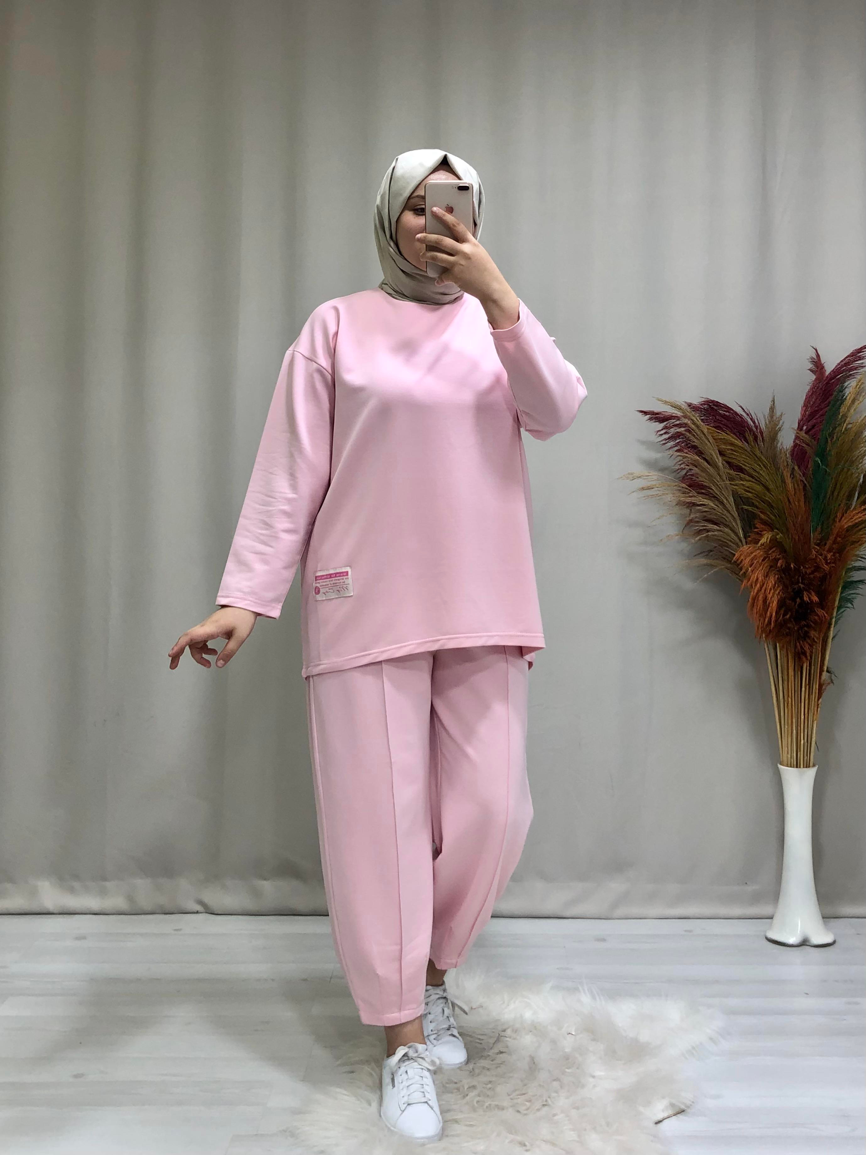 • Kadın 2 iplik kumaş tesettür spor takım. Ürünümüz bisiklet yaka, tunik boyu ön kısa arka uzun şeklinde ,pantolon beli lastikli, havuç paça çima dikişlidir.