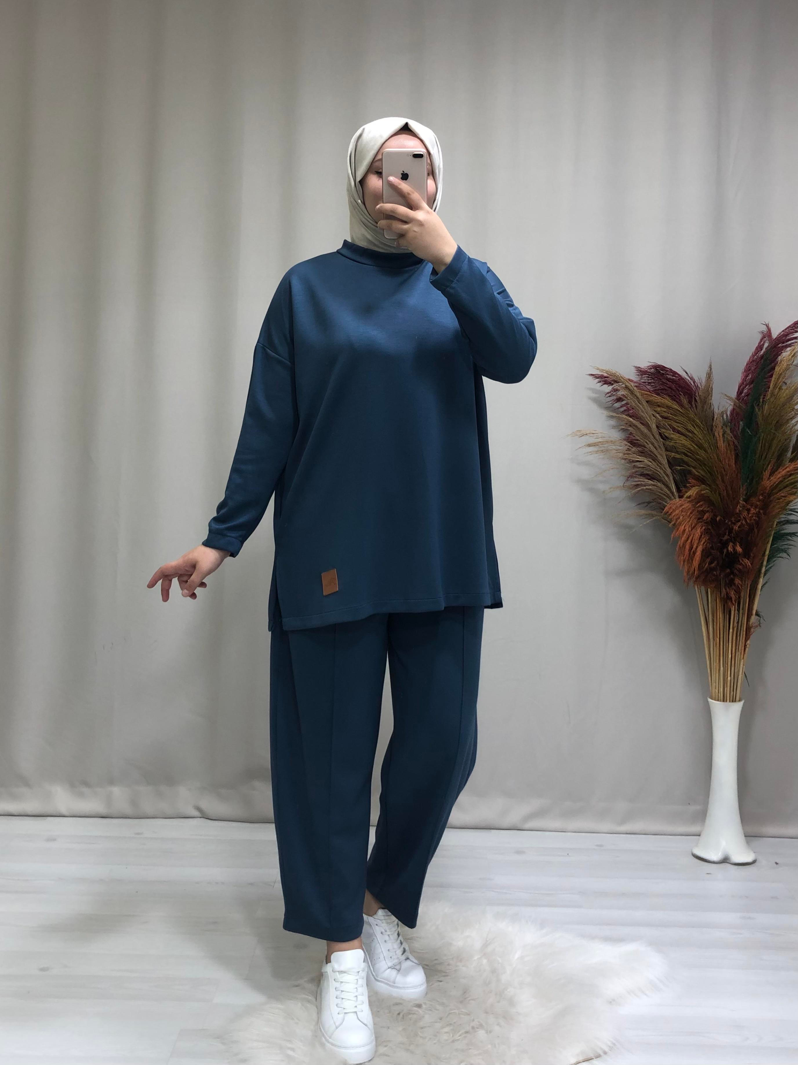 • Kadın 2 iplik kumaş tesettür spor takım. Ürünümüz bisiklet yaka, kenarları yırtmaçlı rahat kalıp, pantolon beli lastikli, havuç paçadır.