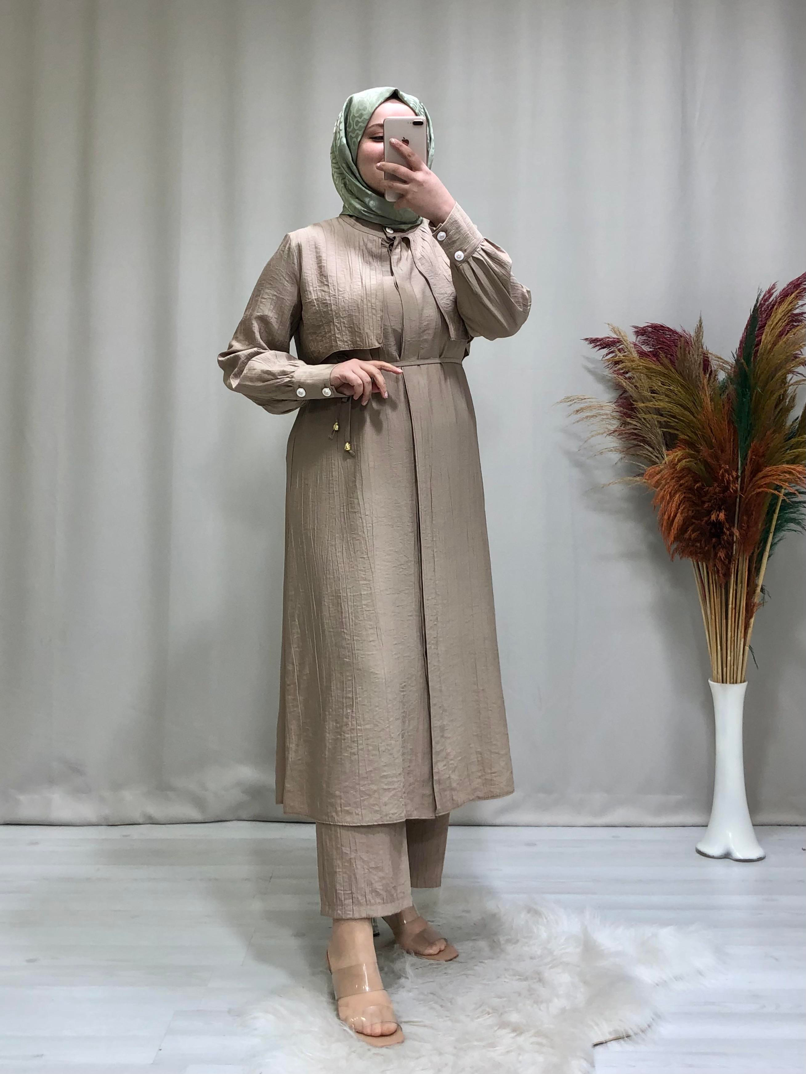 • Kadın aerobin kumaş  belden bağlama detaylı tesettür takım. Ürünümüz önden düğmeli, belden çıkarılabilir bağcık detaylıdır.