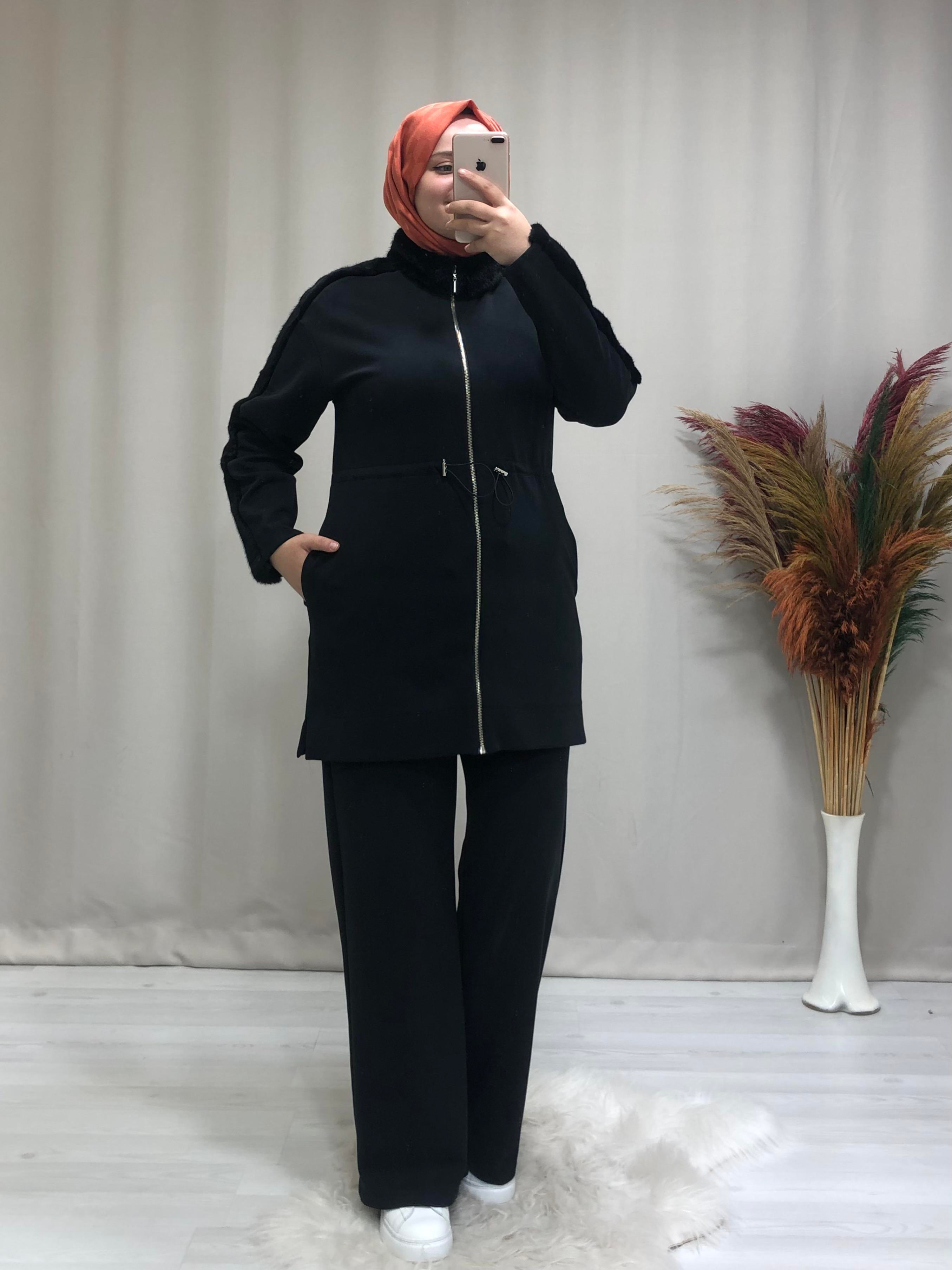 Kadın angora detaylı tesettür takım. Ürünümüz hakim yaka, önden fermuarlı, belden büzgülü,kol ve boyun kısmında angora detayları bulunmaktadır.Pantolon beli lastikli