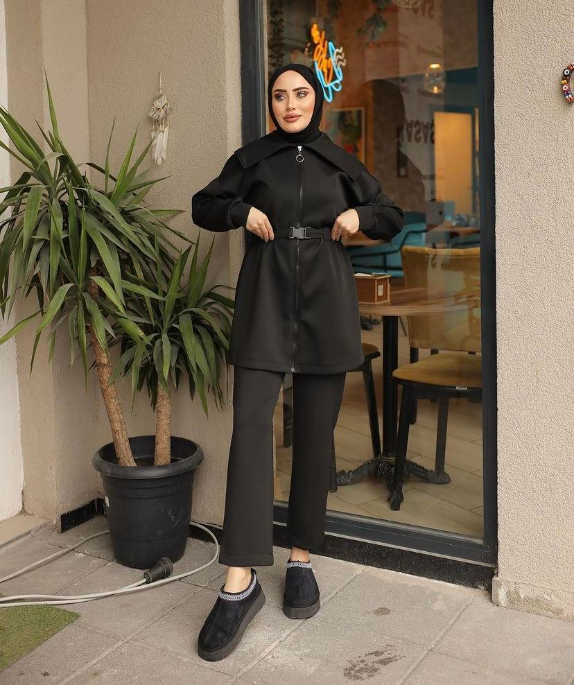 Kadın Belden Kemer Detaylı Scuba Tesettür Takım. Ürünümüz hakim yaka önden fermuarlı belden kemer detaylı ve ürünümüzün altı beli lastikli boru paçadır.
