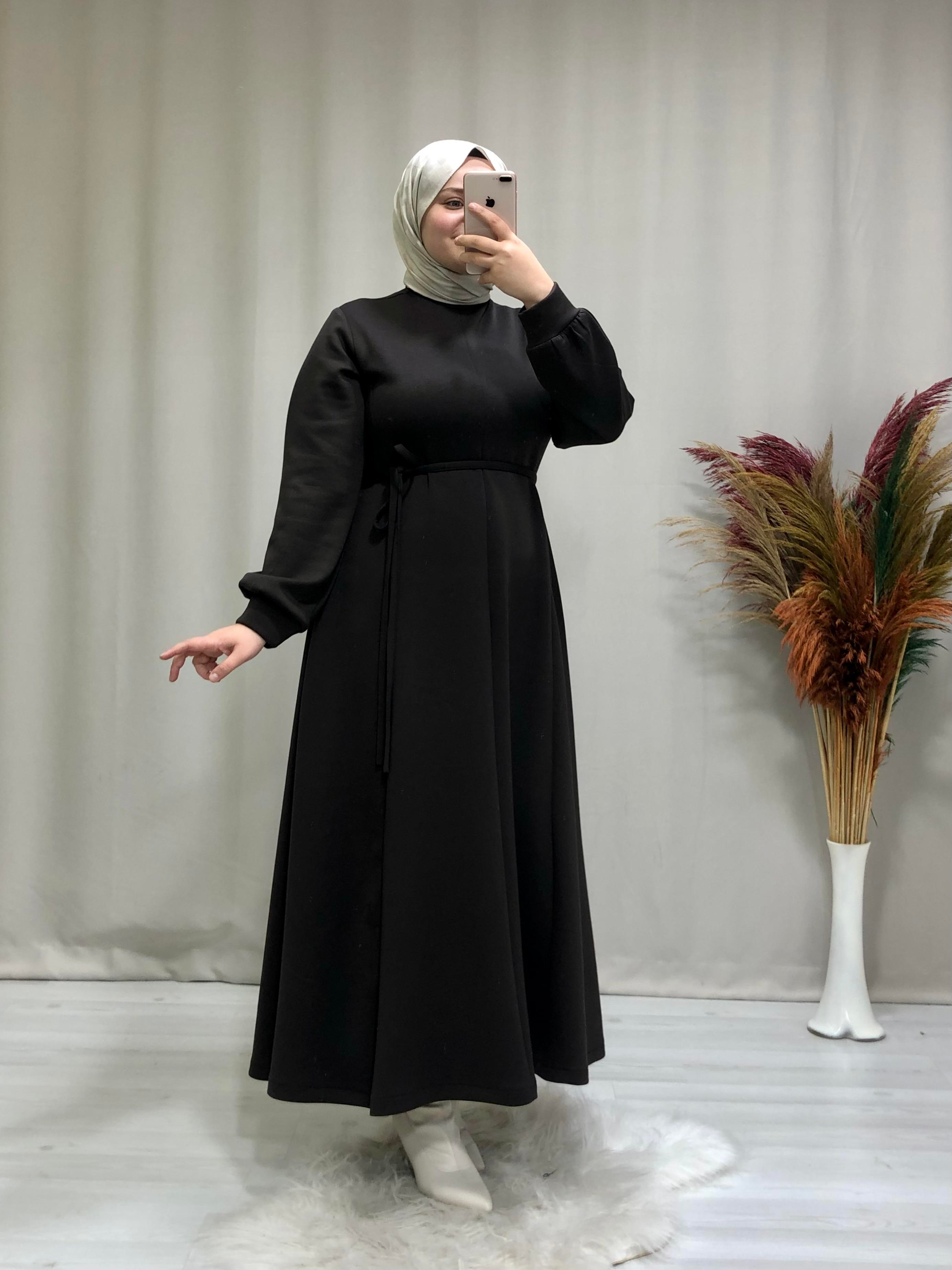 • Kadın belden kuşak detaylı tesettür elbise. Ürünümüz dik yaka, belden çıkarılabilir kuşak detaylı, etek kısmı kloş inmektedir.