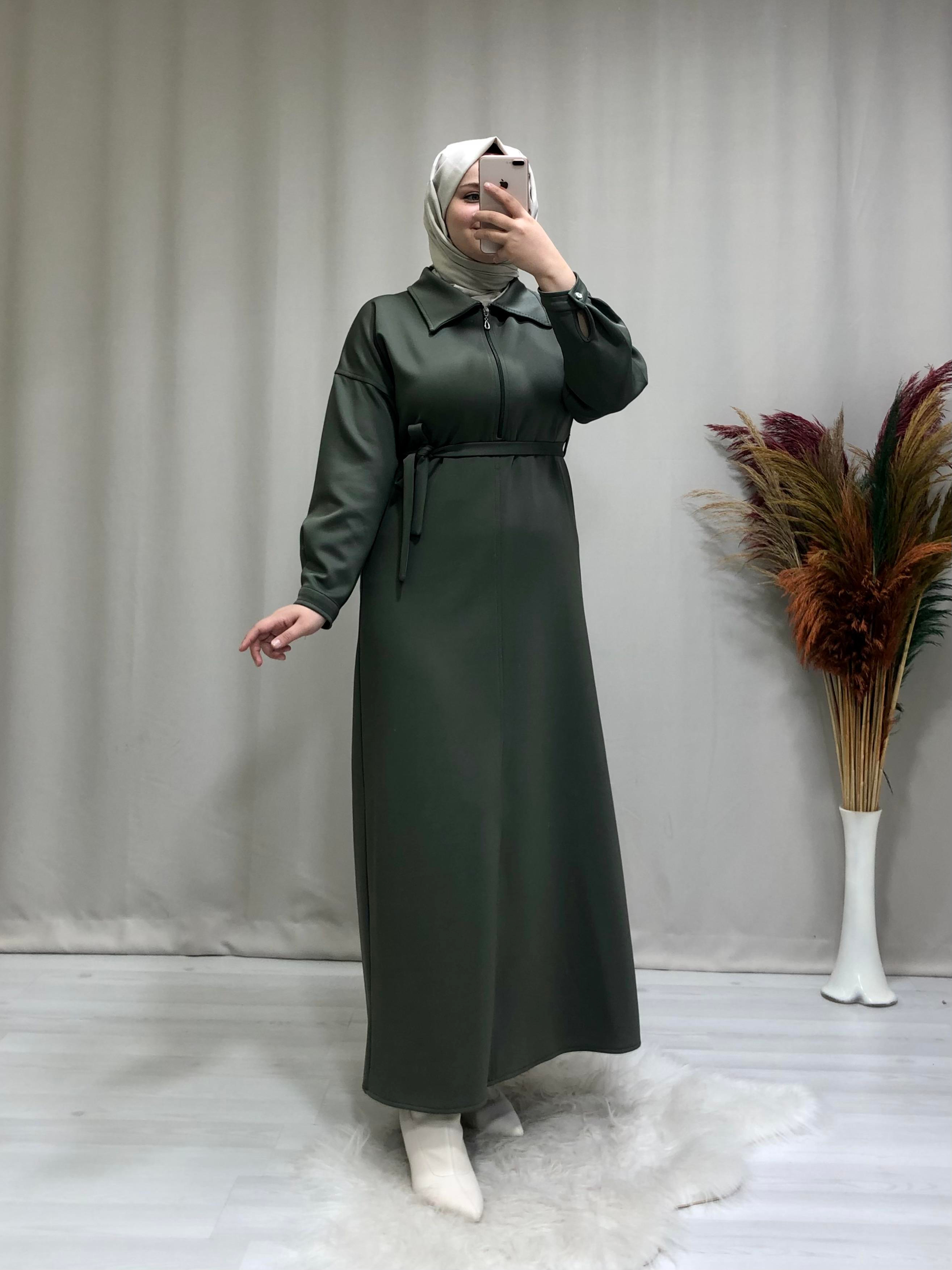 Kadın belden kuşaklı  scuba tesettür elbise. Ürünümüz gömlek yaka, önden fermuar kapamalı, göğüs kısmına  kadar, rahat kalıptır.
