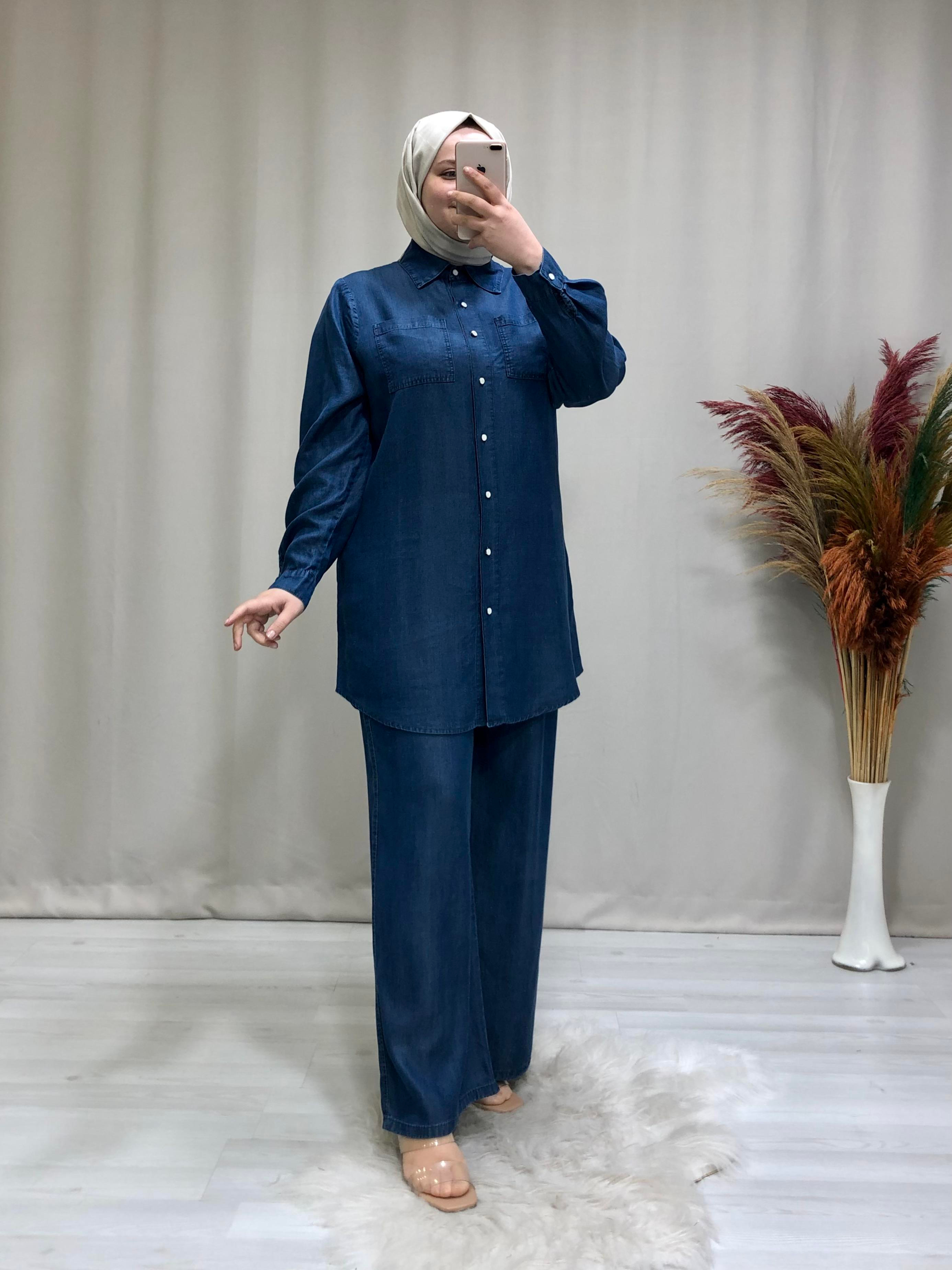 Kadın cep detaylı kot tesettür takım. Ürünümüz önden düğmeli, cep detaylıdır. Pantolonumuz belden lastikli, bol paçadır.