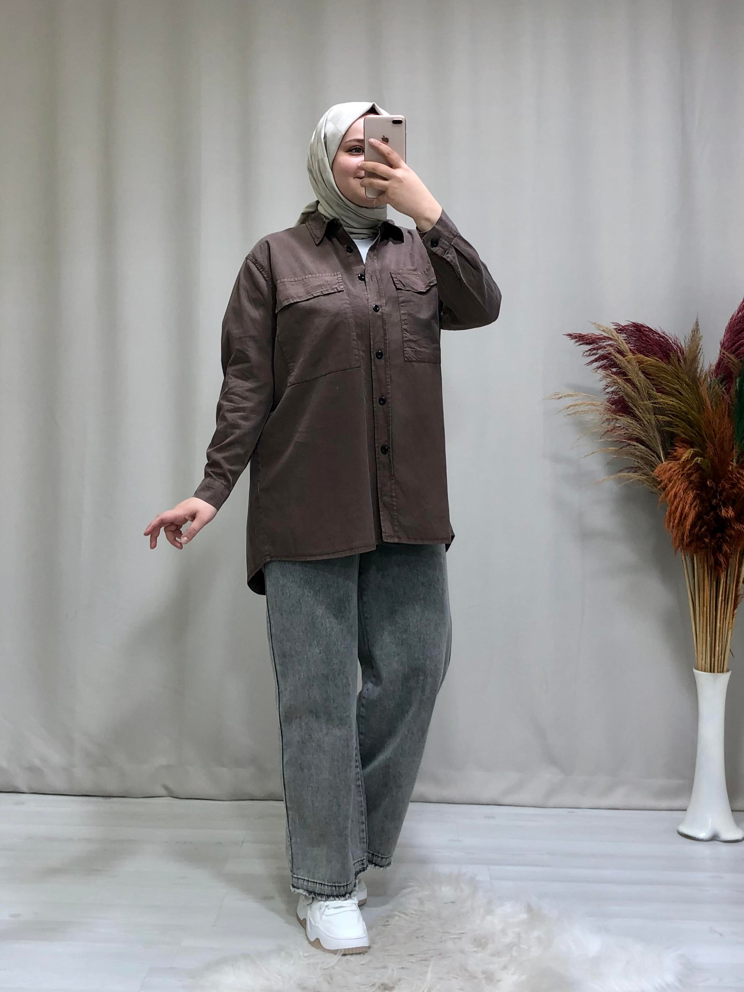 • Kadın cep detaylı oversize tensel tesettür tunik.  Ürünümüz gömlek yaka önden düğmeli, düşük kol, göğüs kısmında cep detaylıdır.