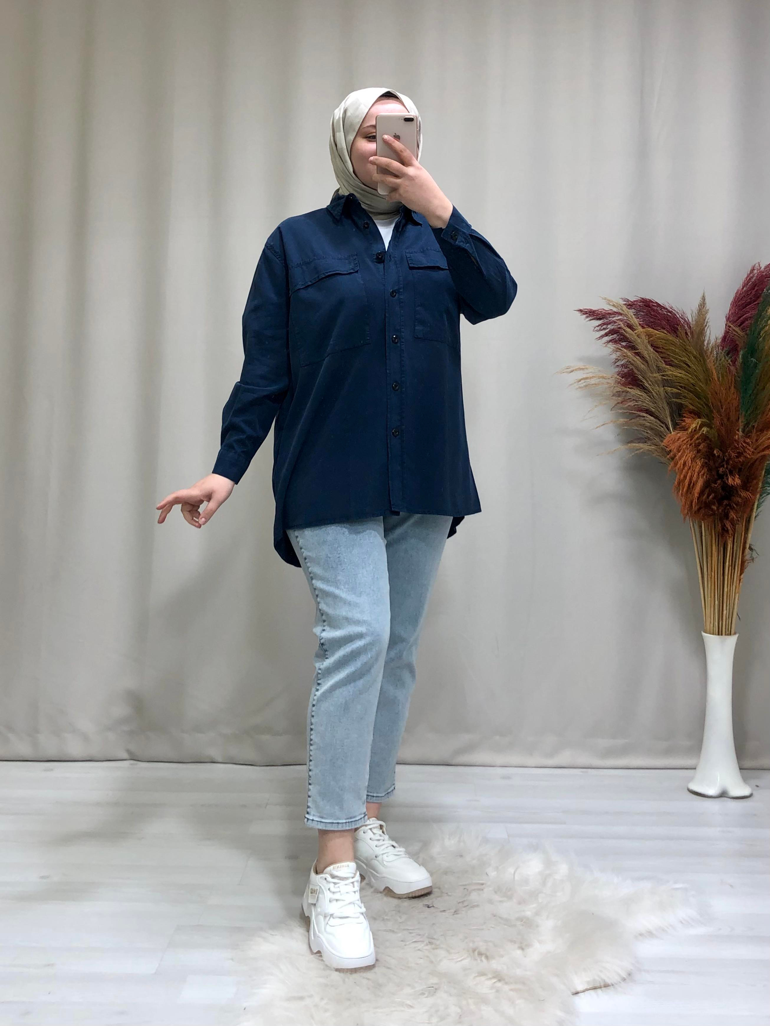 • Kadın cep detaylı oversize tensel tesettür tunik.  Ürünümüz gömlek yaka önden düğmeli, düşük kol, göğüs kısmında cep detaylıdır.