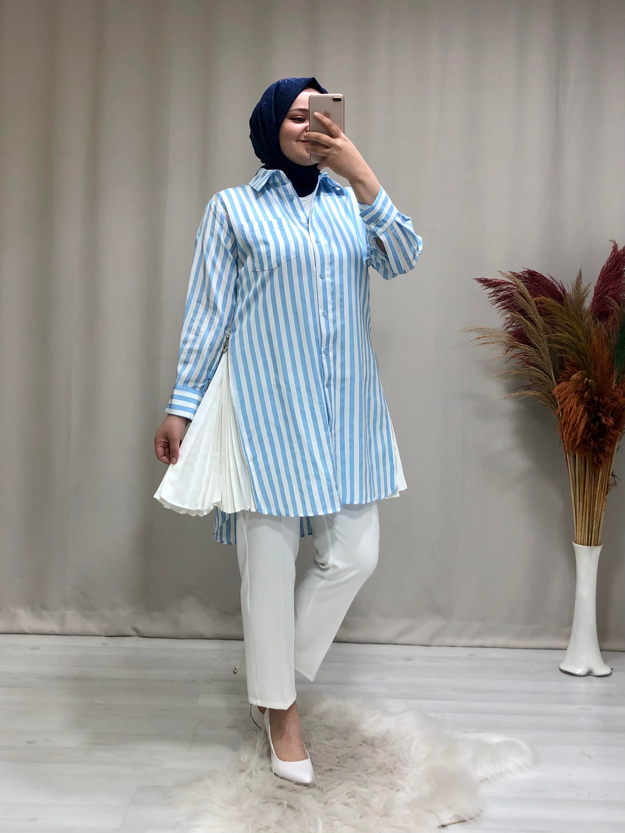 • Kadın çizgili pilise detaylı tesettür tunik. Ürünümüz önden düğmeli, gömlek yaka, etek ucları yandan fermuar detaylı, ön göğüs kısmında