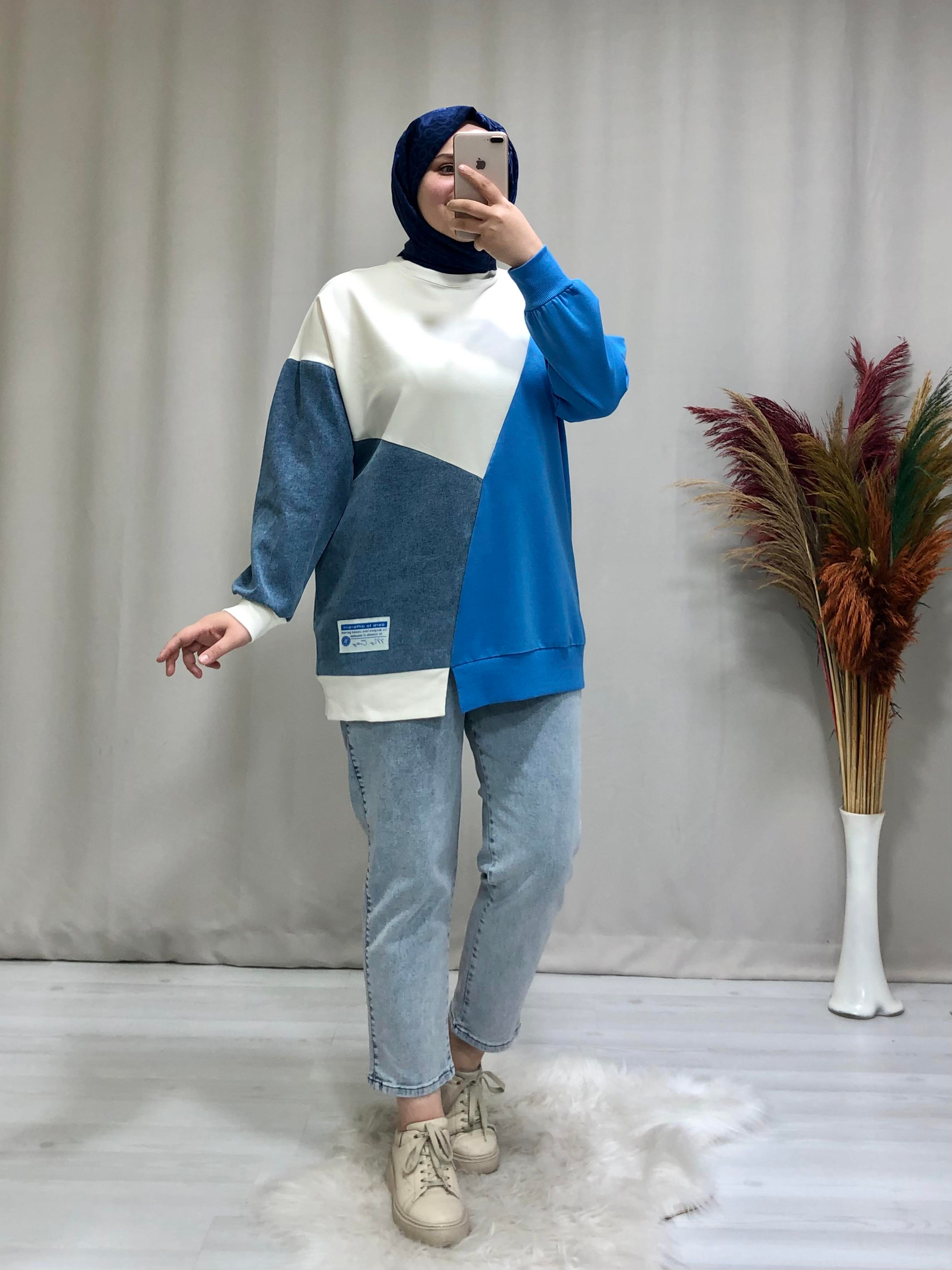 • Kadın denim detaylı tesettür sweat. Ürünümüz bisiklet yaka, önden yırtmaç detaylı, salaş kalıptır.
