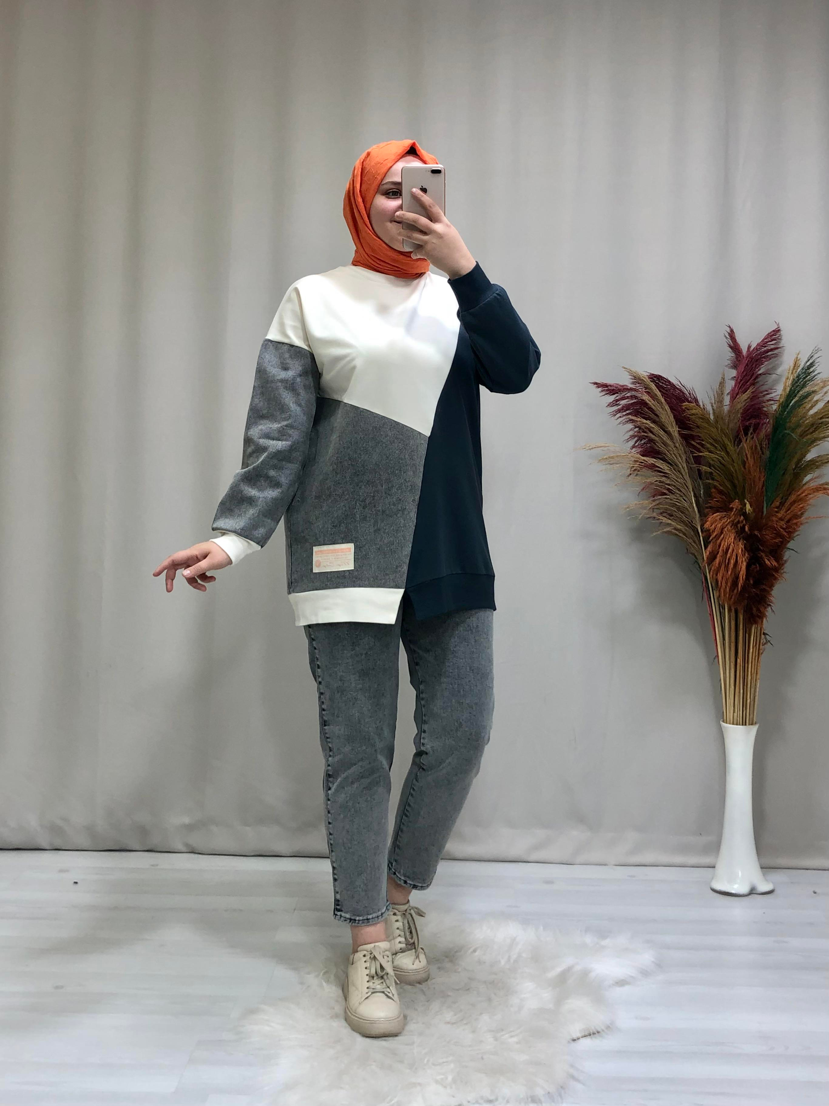 • Kadın denim detaylı tesettür sweat. Ürünümüz bisiklet yaka, önden yırtmaç detaylı, salaş kalıptır.