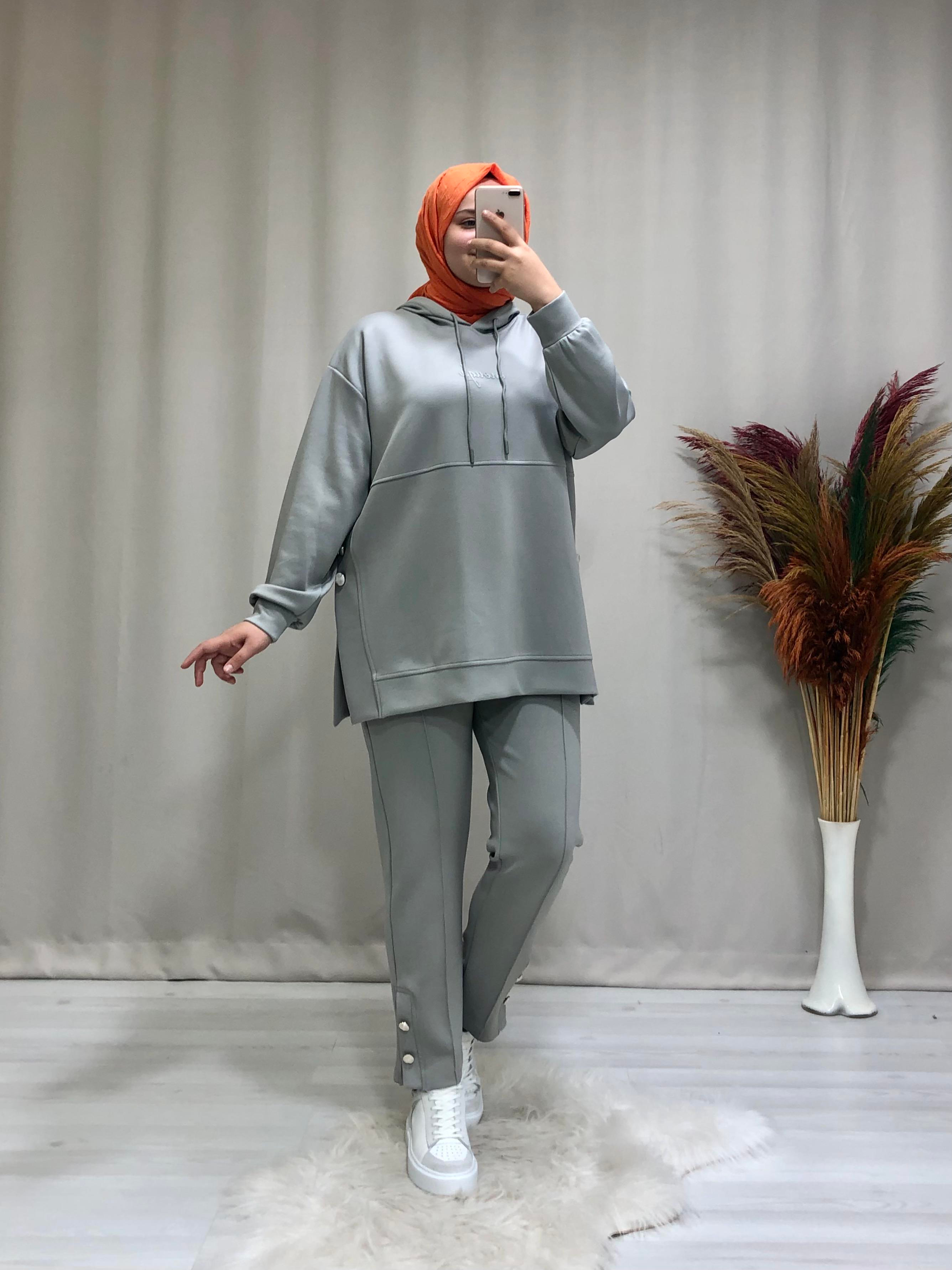 • Kadın düğme detaylı baskılı tesettür takım. Ürünümüz kapüşonlu, yandan düğmeli ve yırtmaçlı, oversize kalıp. Pantolonumuz havuç beli lastiiklidir.