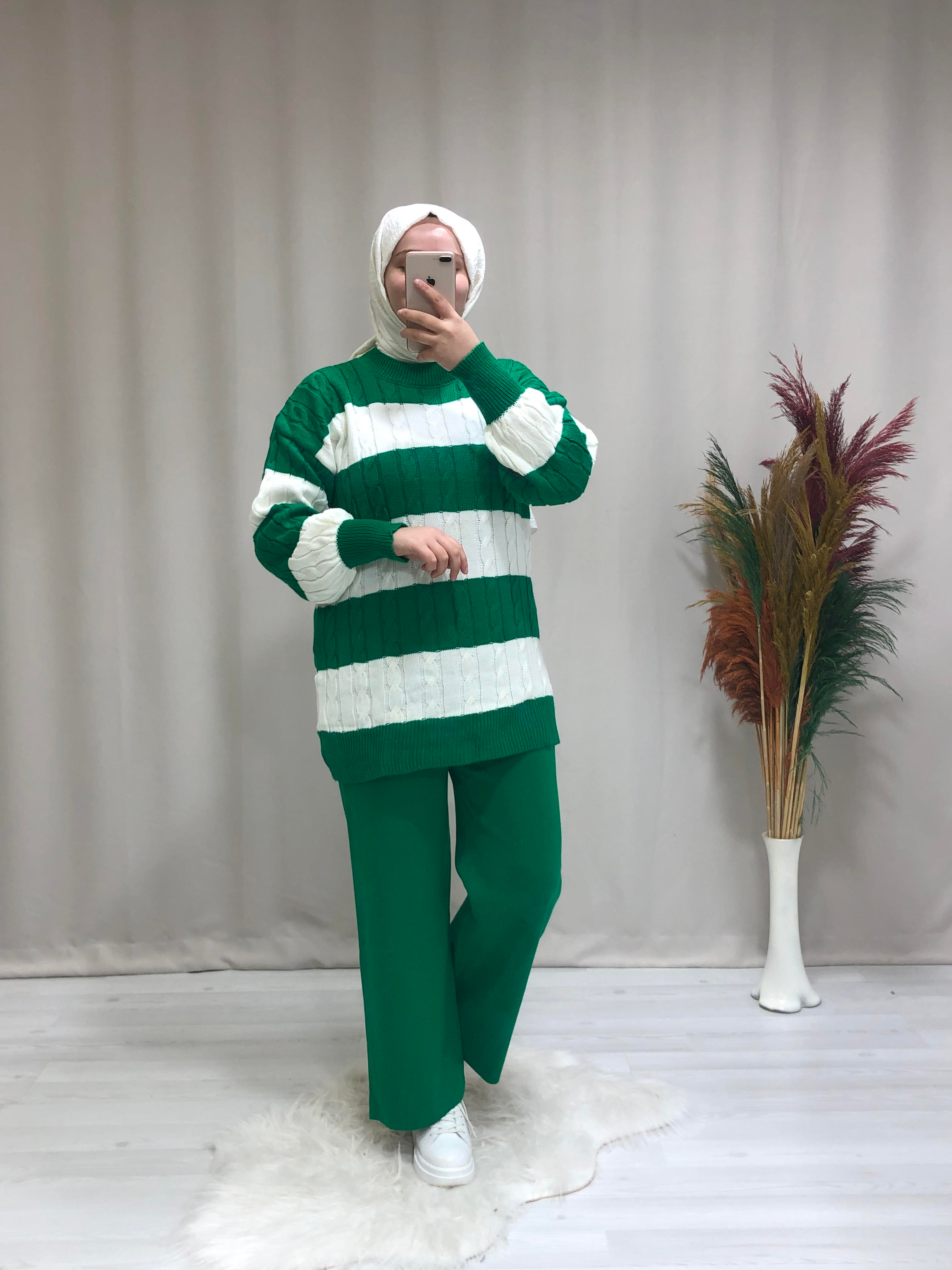 Kadın Enine Çizgili Örgü Detay Tesettür Triko Takım.