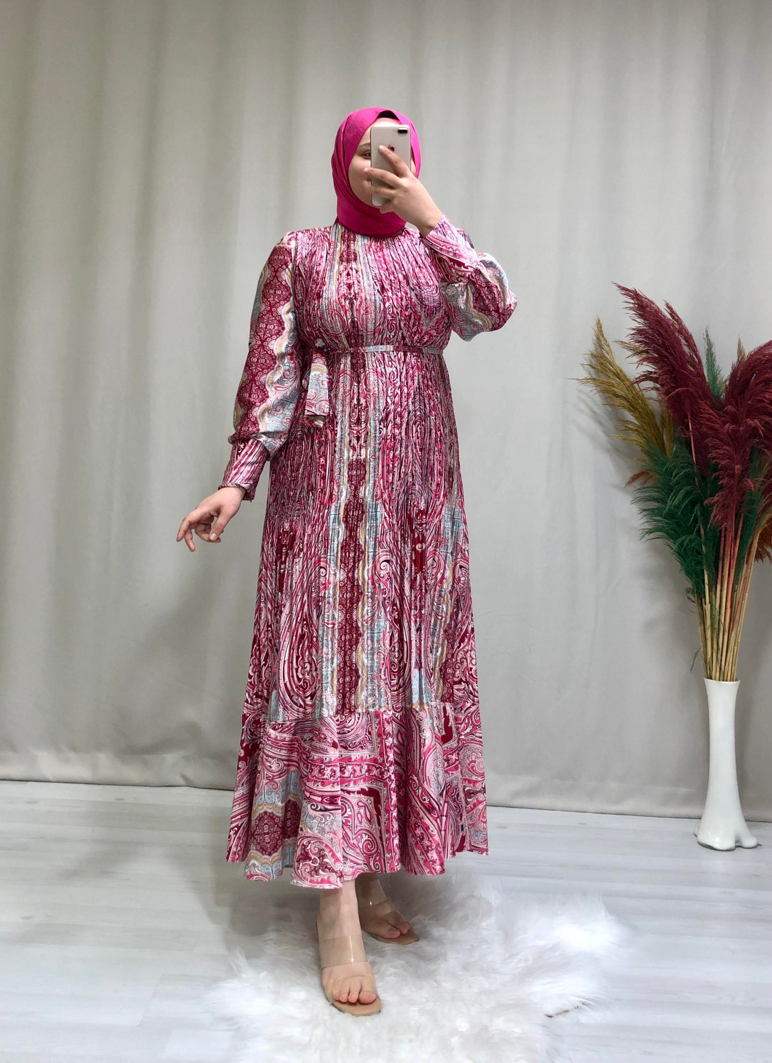 • Kadın etnik desenli saten tesettür şık elbise. Ürünümüz balon kollu, kendinden desenli, balon kol,  saten kumaşa sahiptir,