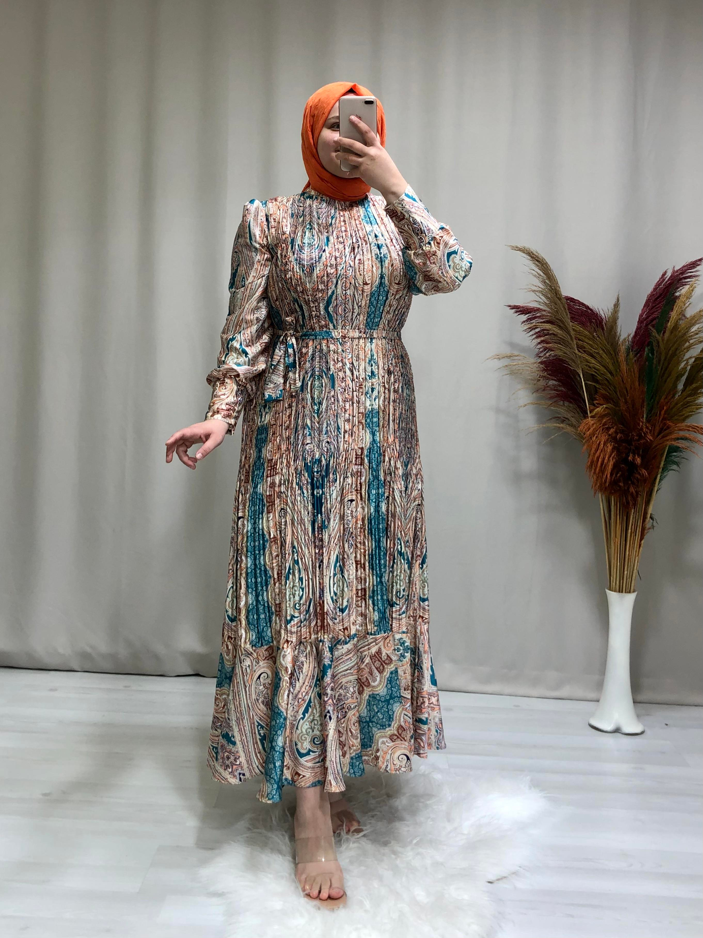 • Kadın etnik desenli saten tesettür şık elbise. Ürünümüz balon kollu, kendinden desenli, balon kol,  saten kumaşa sahiptir,