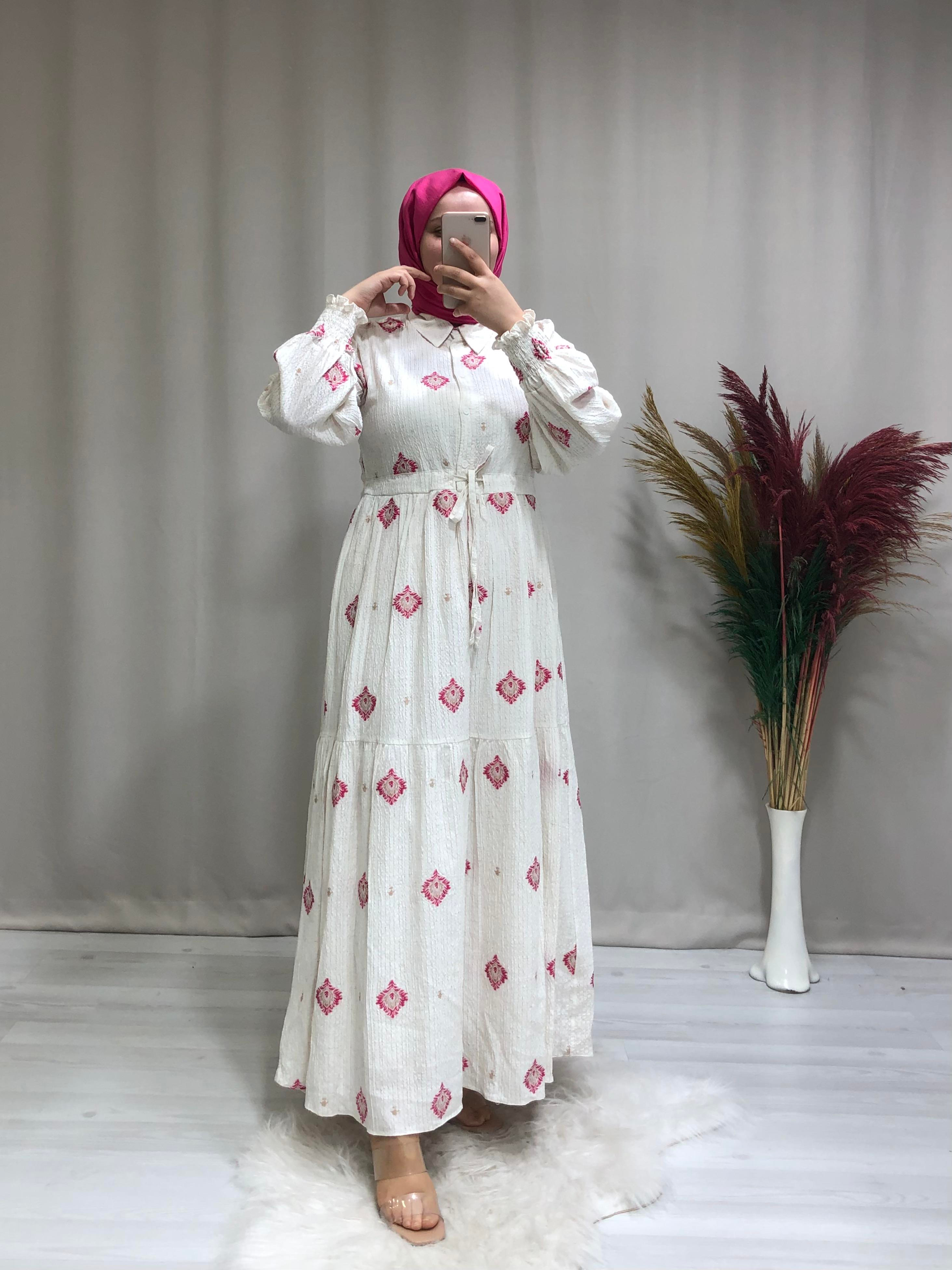 Kadın gofre kumaş belden büzgülü tesettür elbise. Ürünümüz gömlek yaka, önden göğüse kadar düğmeli, belden büzgü detaylı, kendinden desenlidir.