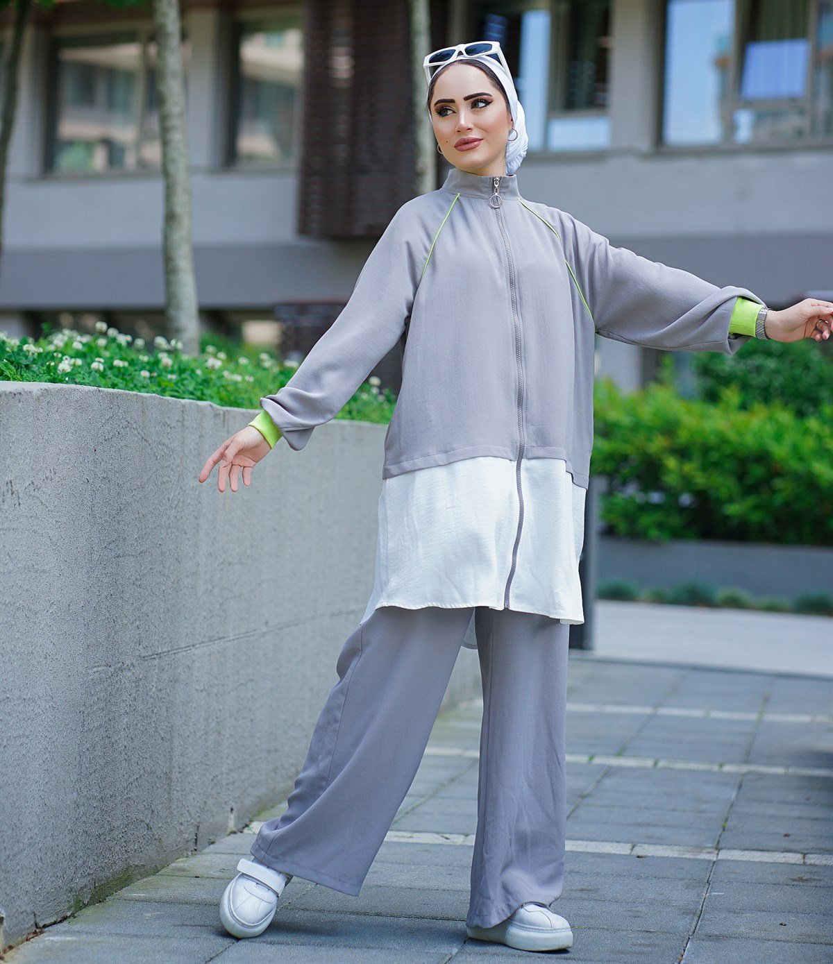 Kadın Gri Önden Fermuarlı Tesettür Takım.