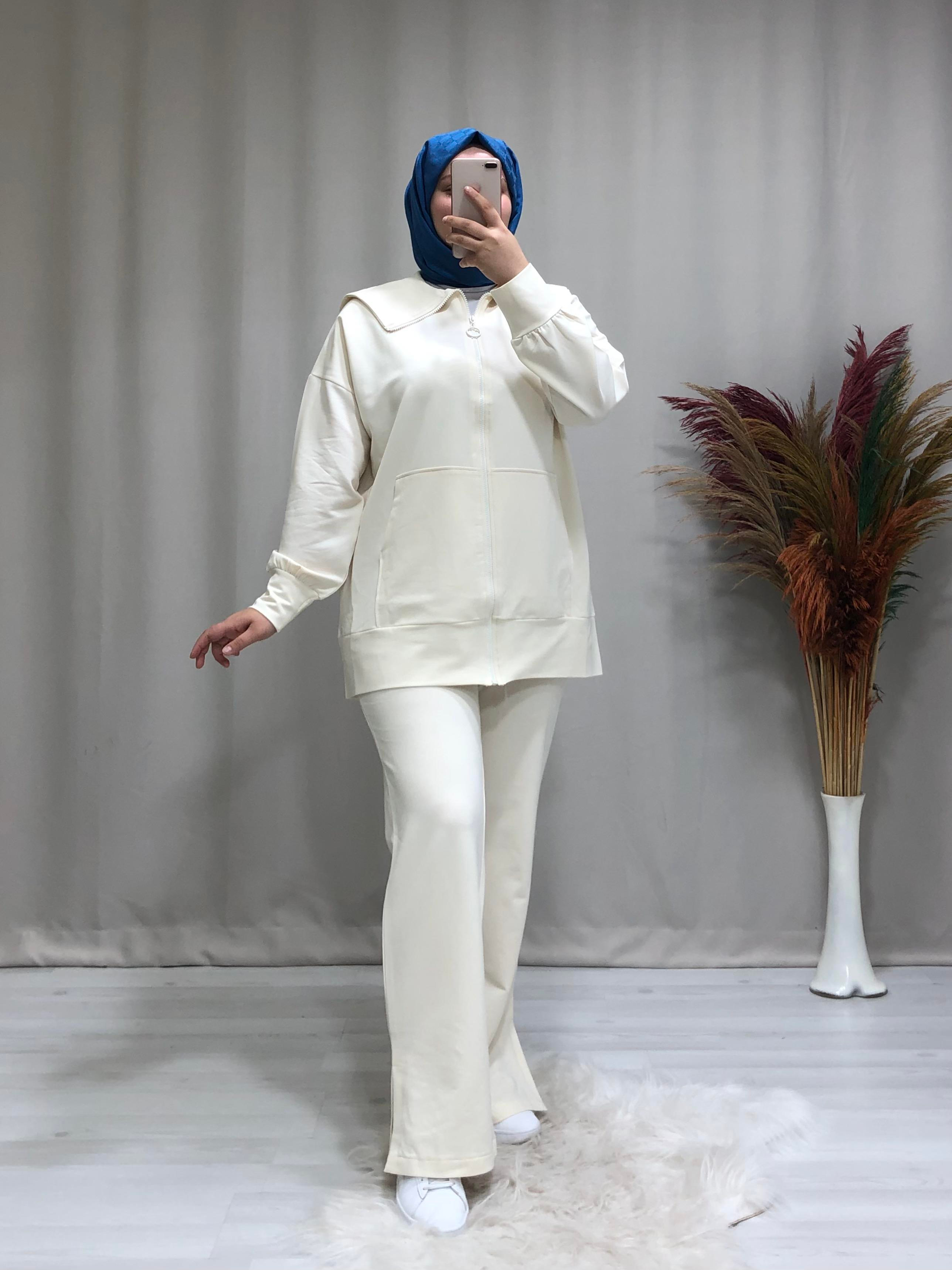 Kadın iki iplik önden fermuarlı spor tesettür takım. Ürünümüz önden fermuarlı,denizci yaka, yanlardan iki cepli, pantolon beli lastikli,paçaları yırtmaçlıdır.