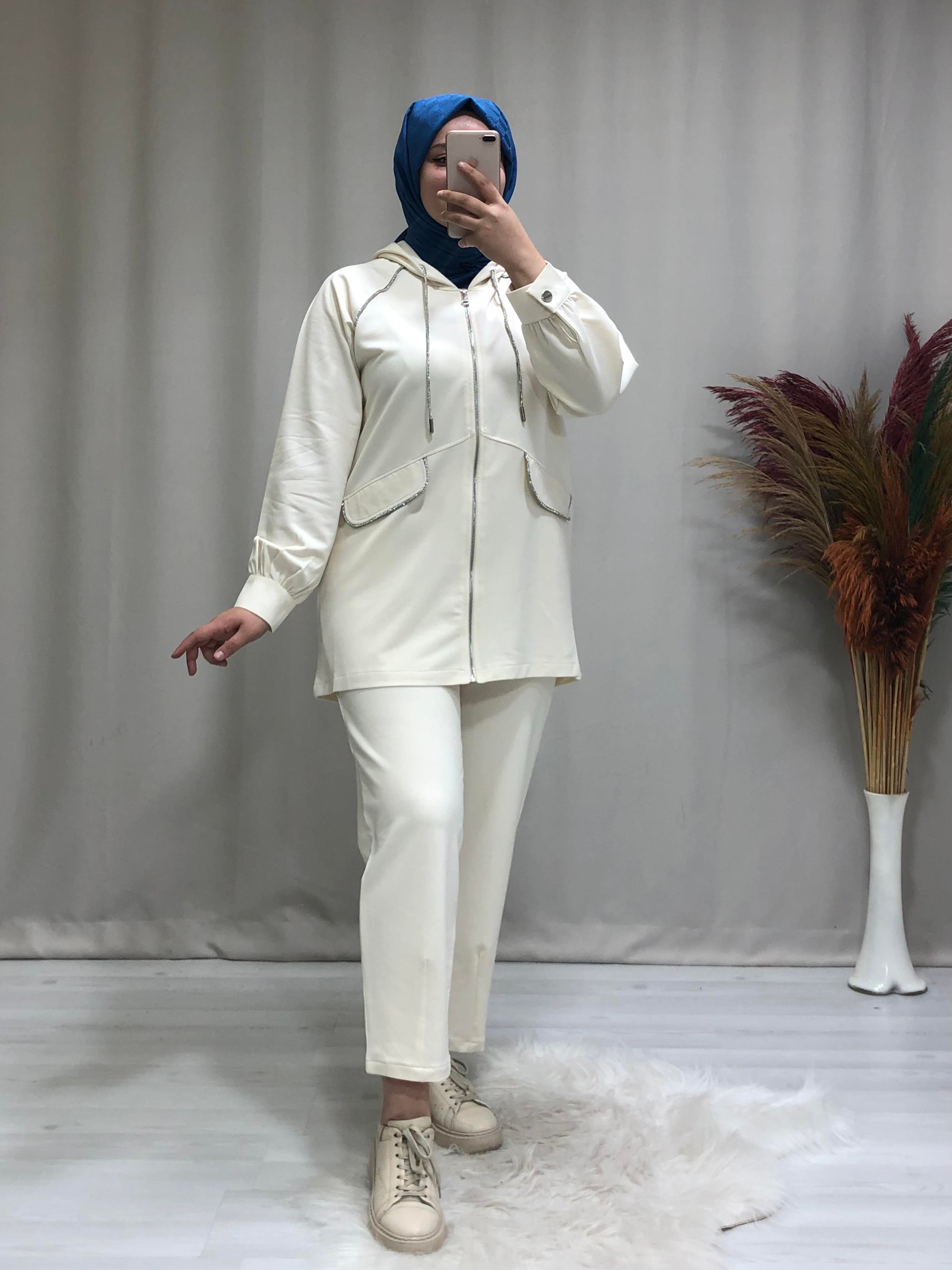 Kadın kapüşonlu taş detaylı spor tesettür takım