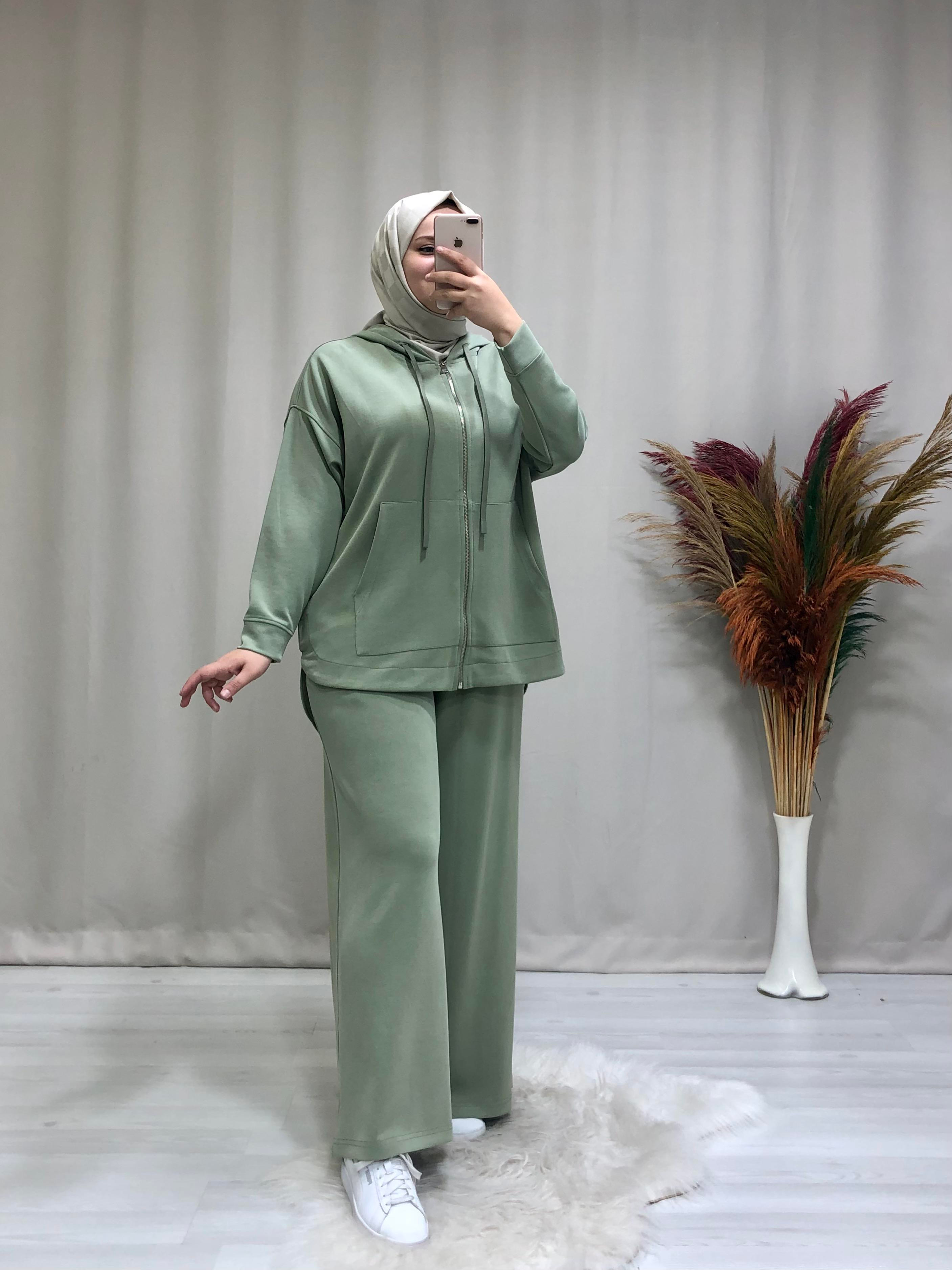• Kadın kapüşonlu tesettür spor takım. Ürünümüz önden fermuarlı, kapüşonlu oversize, pantolon beli lastikli, bol paçadır.