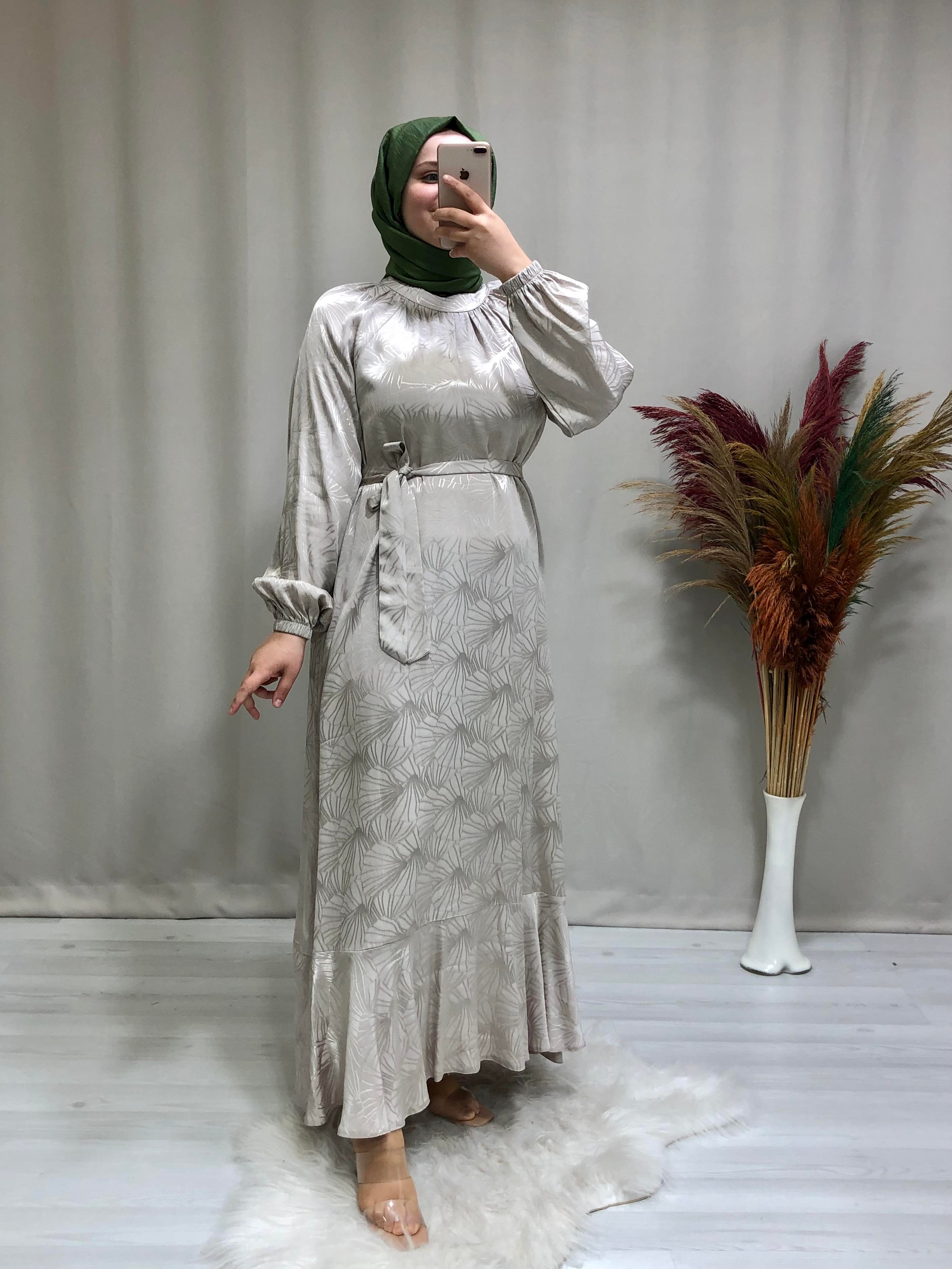 Kadın kendinden desenli jakarlı saten tesettür elbise. Ürünümüz bisiklet yaka, belden kuşaklı,  yaka büzgülü, kol ağzı lastikli ,etek uçları fırfırlı ve  salaş kalıptır.