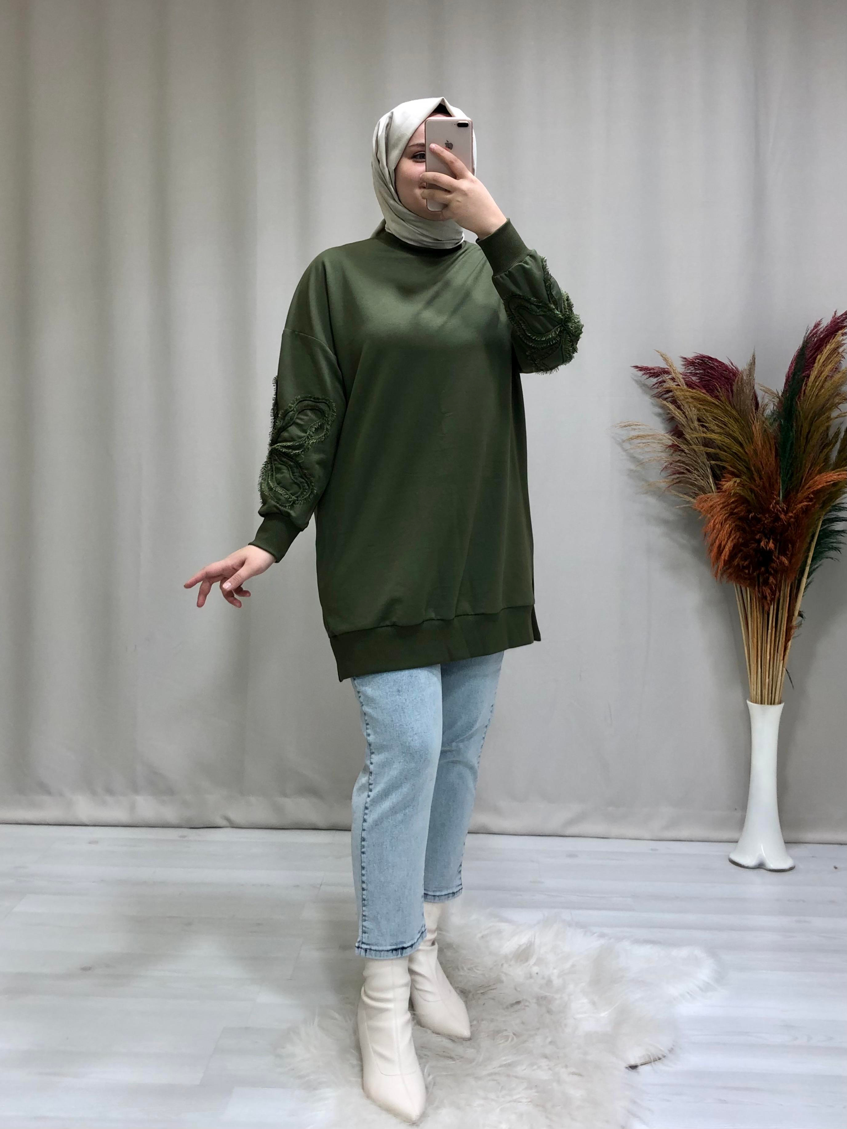 • Kadın kol detaylı tesettür sweat. Ürünümüz bisiklet yaka, rahat kalıptır.