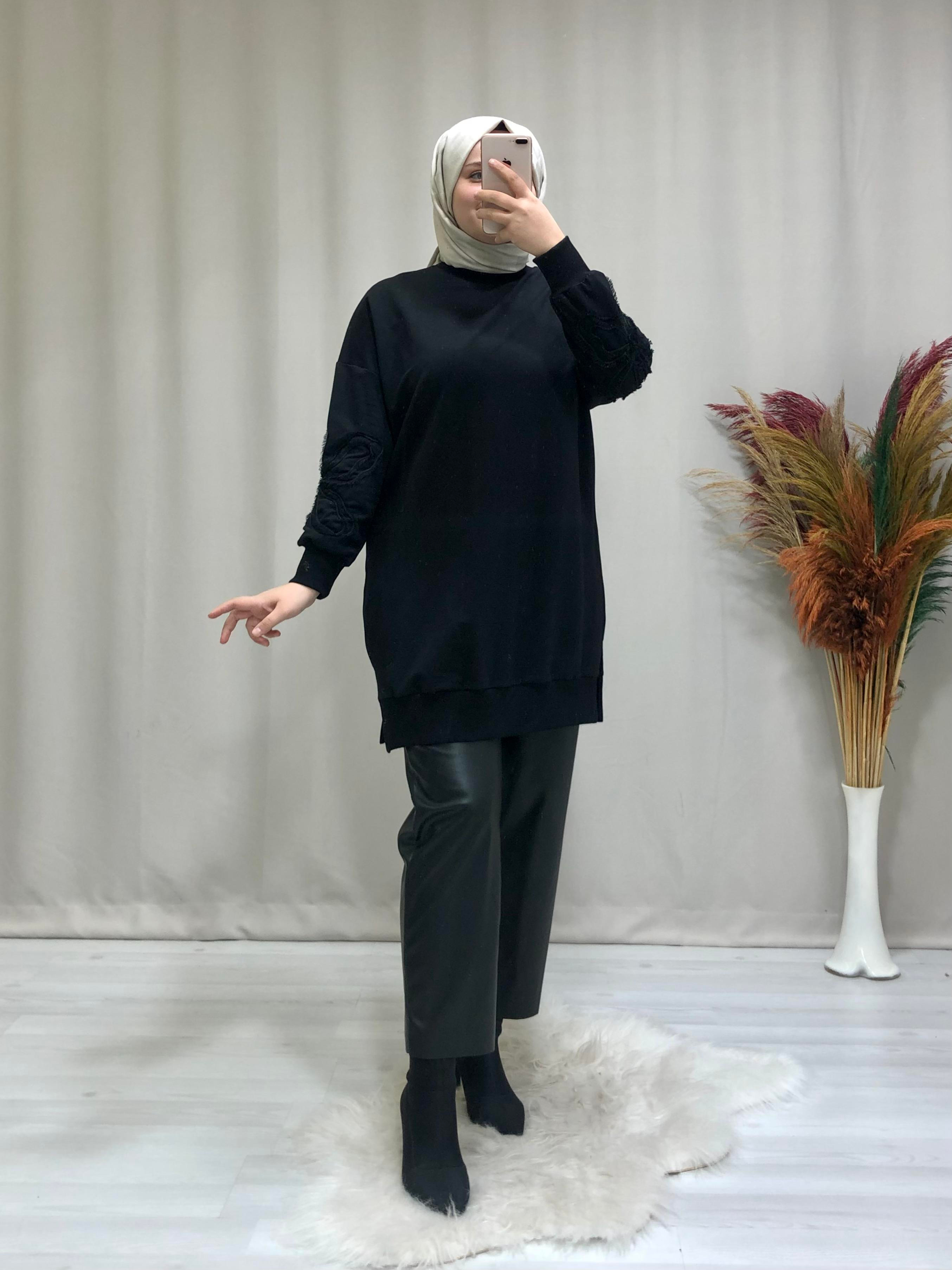• Kadın kol detaylı tesettür sweat. Ürünümüz bisiklet yaka, rahat kalıptır.