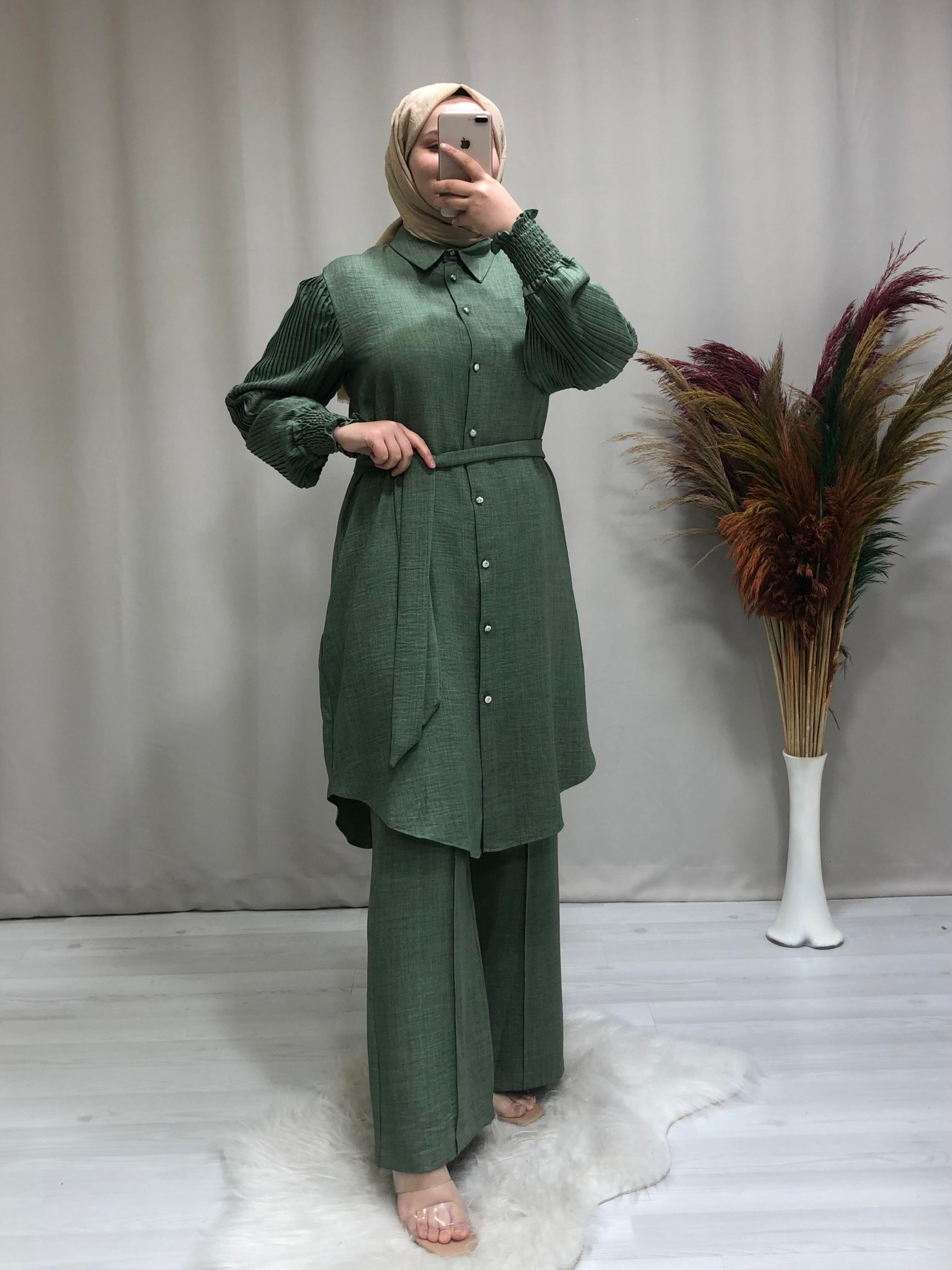 Kadın kolları plise detaylı ikili tesettür takım. Ürünümüz gölek yaka, önden düğmeli, kolları plise detaylı, kumaşı keten aerobin kumaştır.