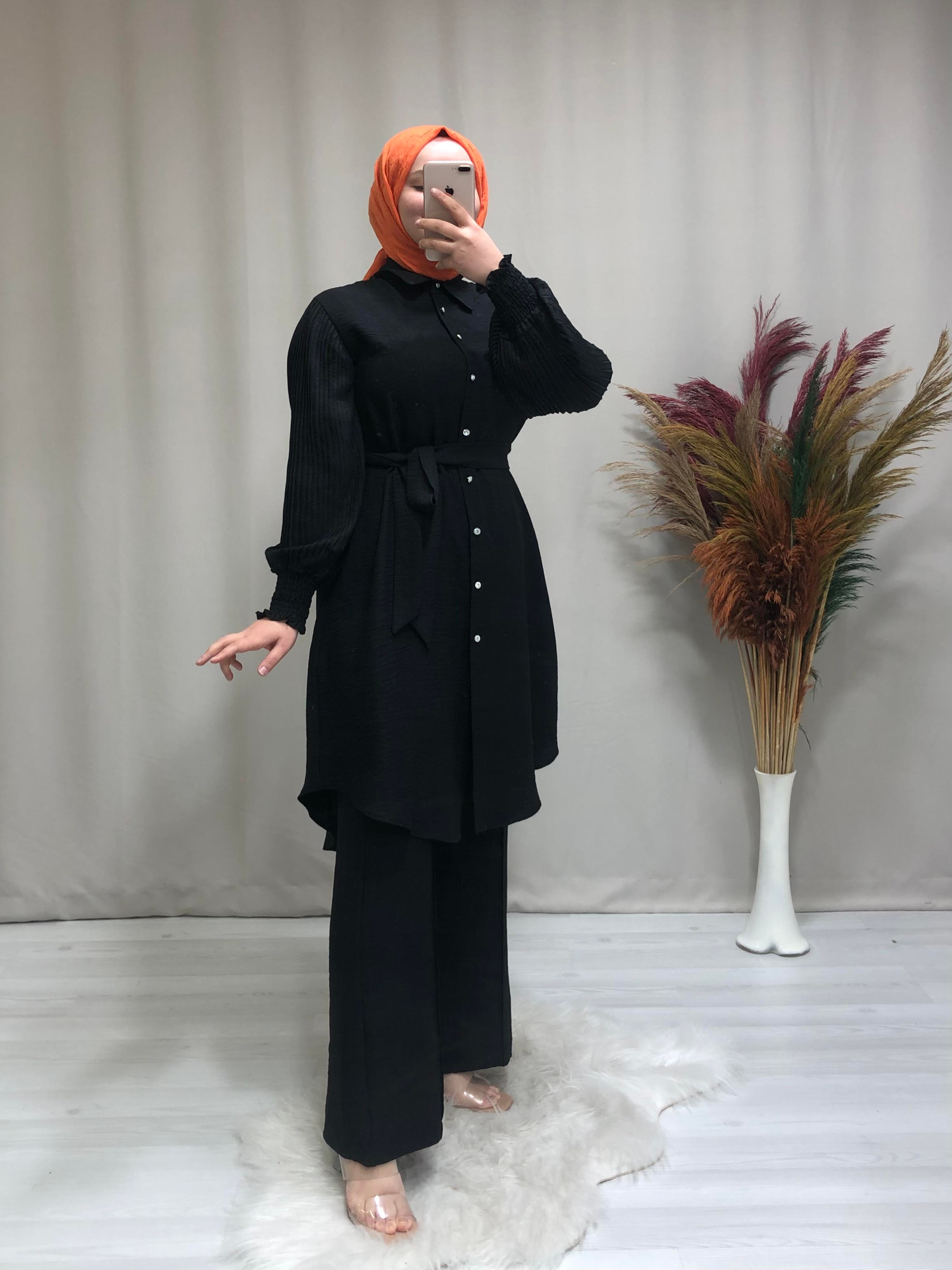 Kadın kolları plise detaylı ikili tesettür takım. Ürünümüz gölek yaka, önden düğmeli, kolları plise detaylı, kumaşı keten aerobin kumaştır.