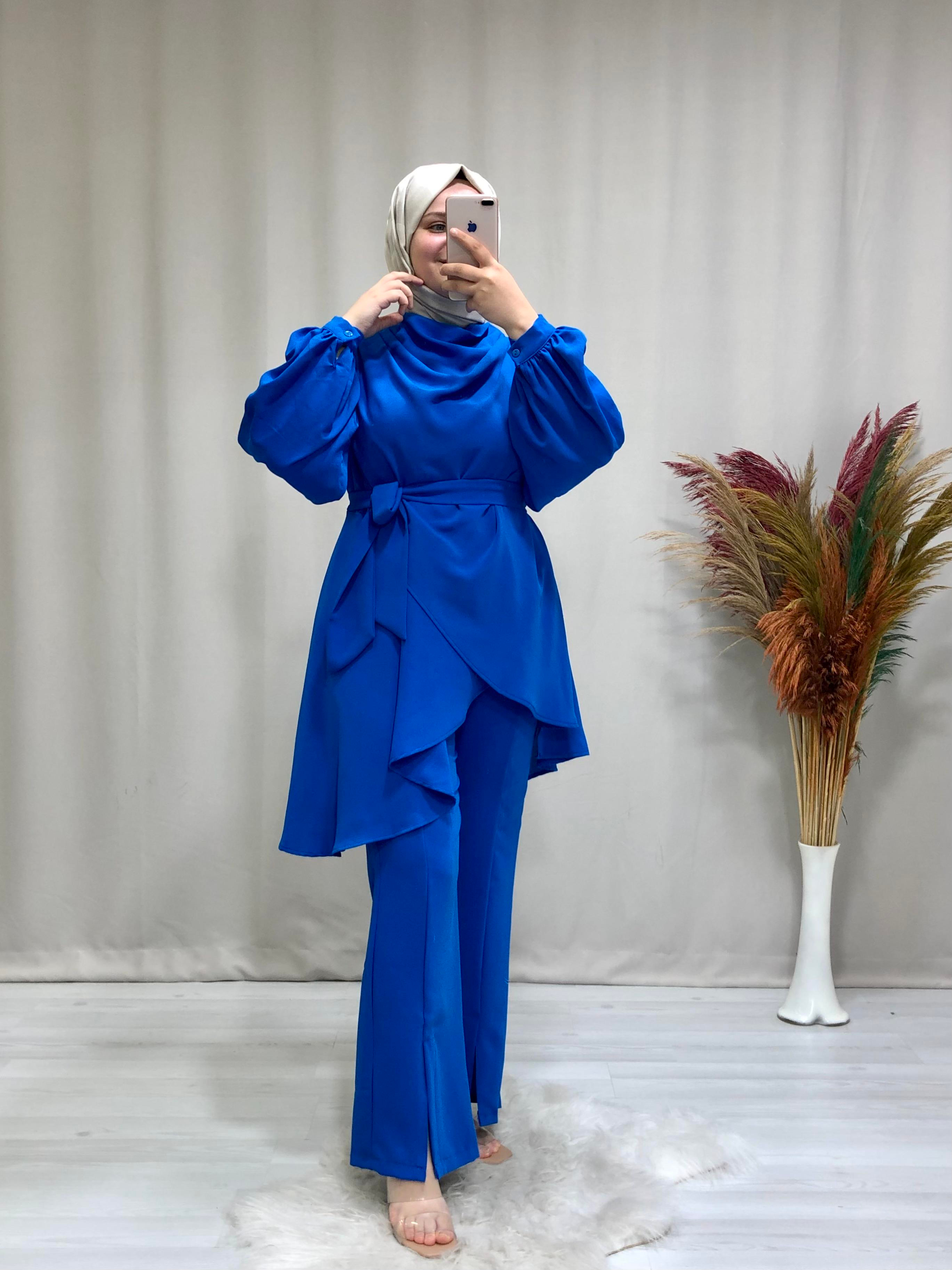 • Kadın krep kumaş şık tesettür  ikili takım. Ürünümüz degaje yaka, belden kuşaklı, pantolon bol paça, önden yırtmaçlıdır.