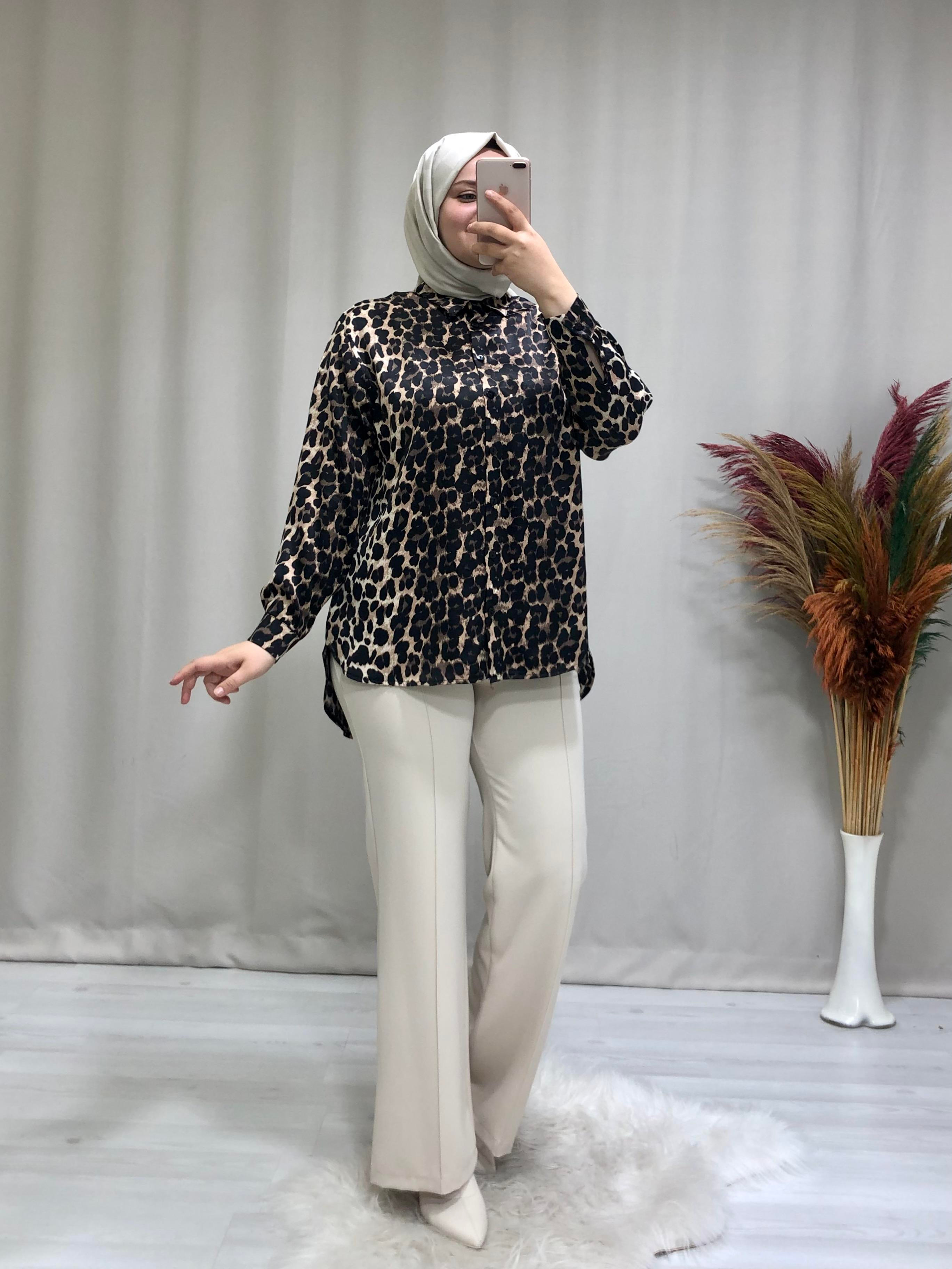 • Kadın leopar desenli saten tesettür  tunik. Ürünümüz gömlek yaka, önden düğmeli, oversize kalıptır.