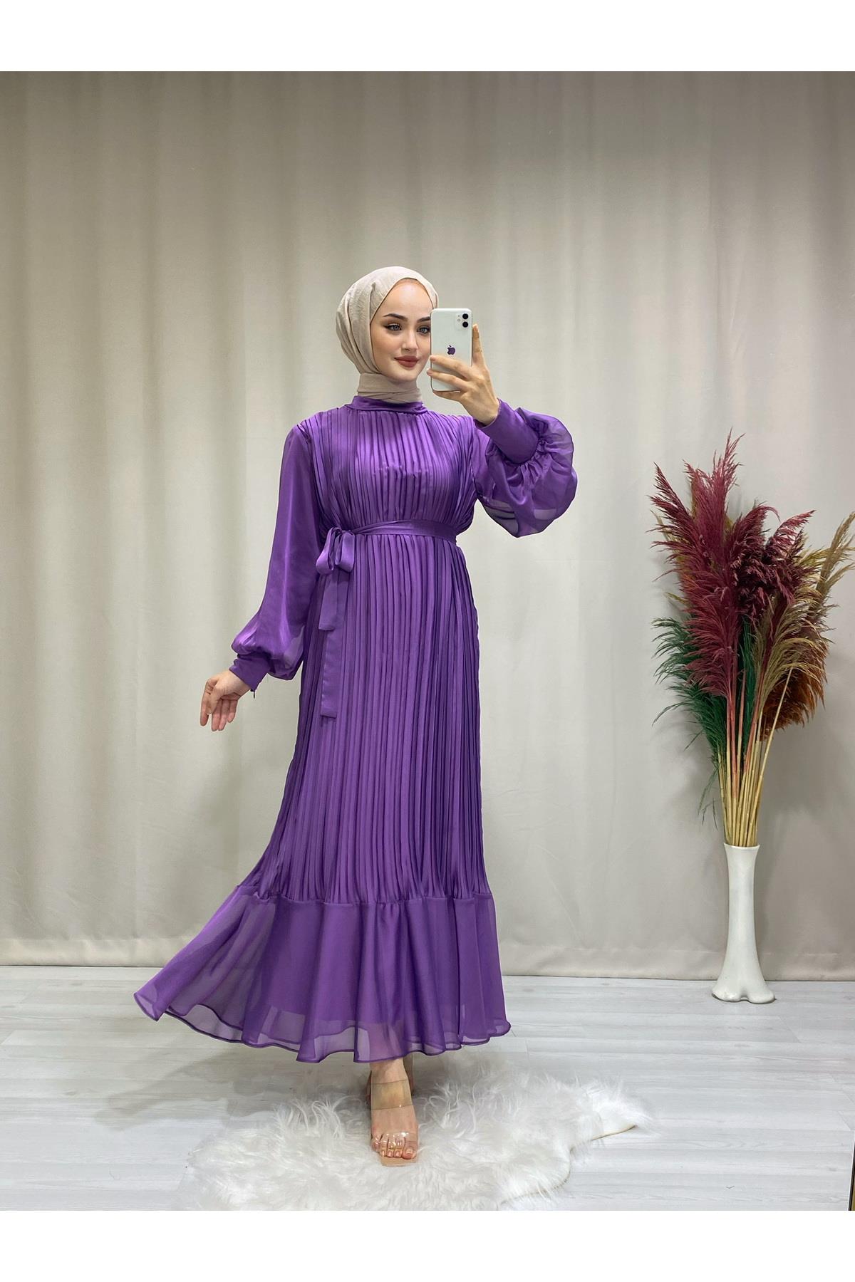 KADIN LİLA TESETTÜR PİLİSELİ JANJAN ŞİFON ELBİSE