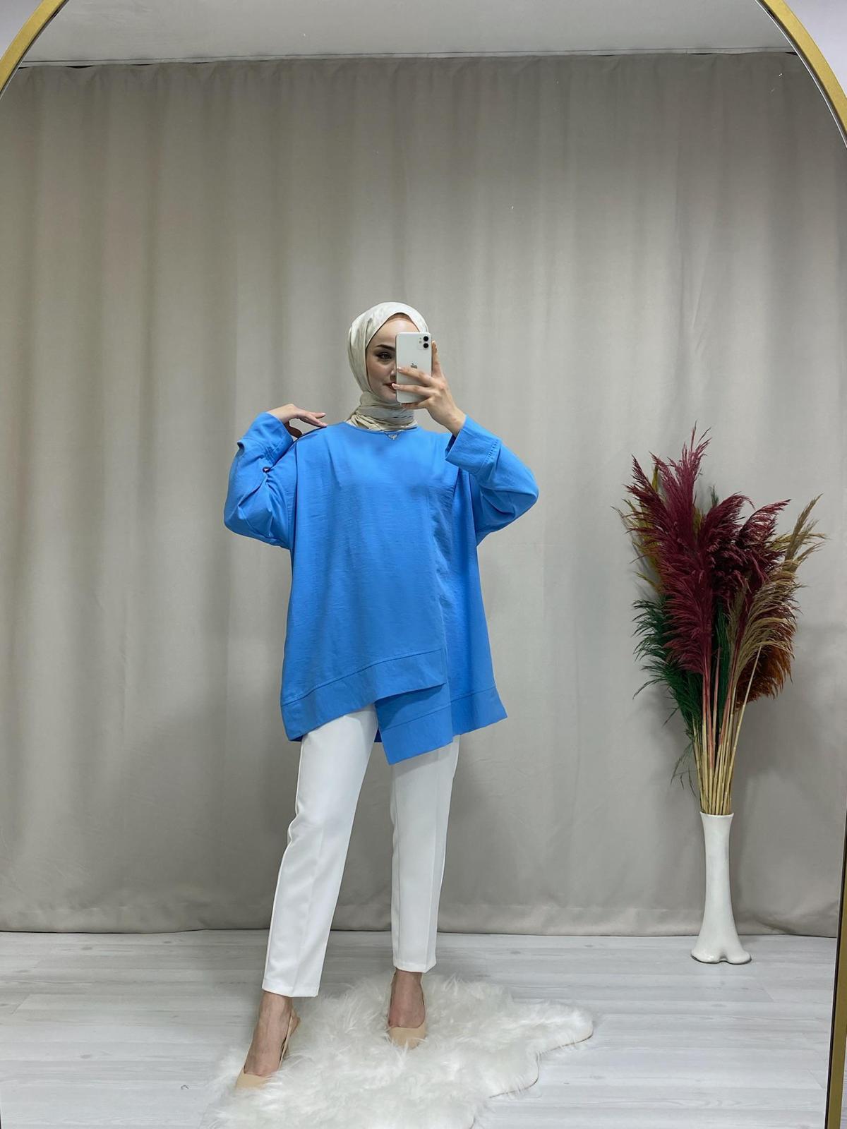 KADIN MAVİ AEROBİN KUMAŞ ASİMETRİK KESİM TESETTÜR TUNİK