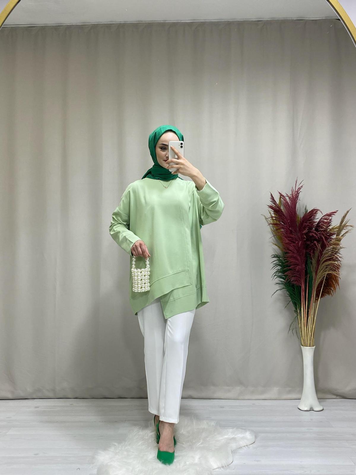 KADIN MİNT YEŞİLİ AEROBİN KUMAŞ ASİMETRİK KESİM TESETTÜR TUNİK