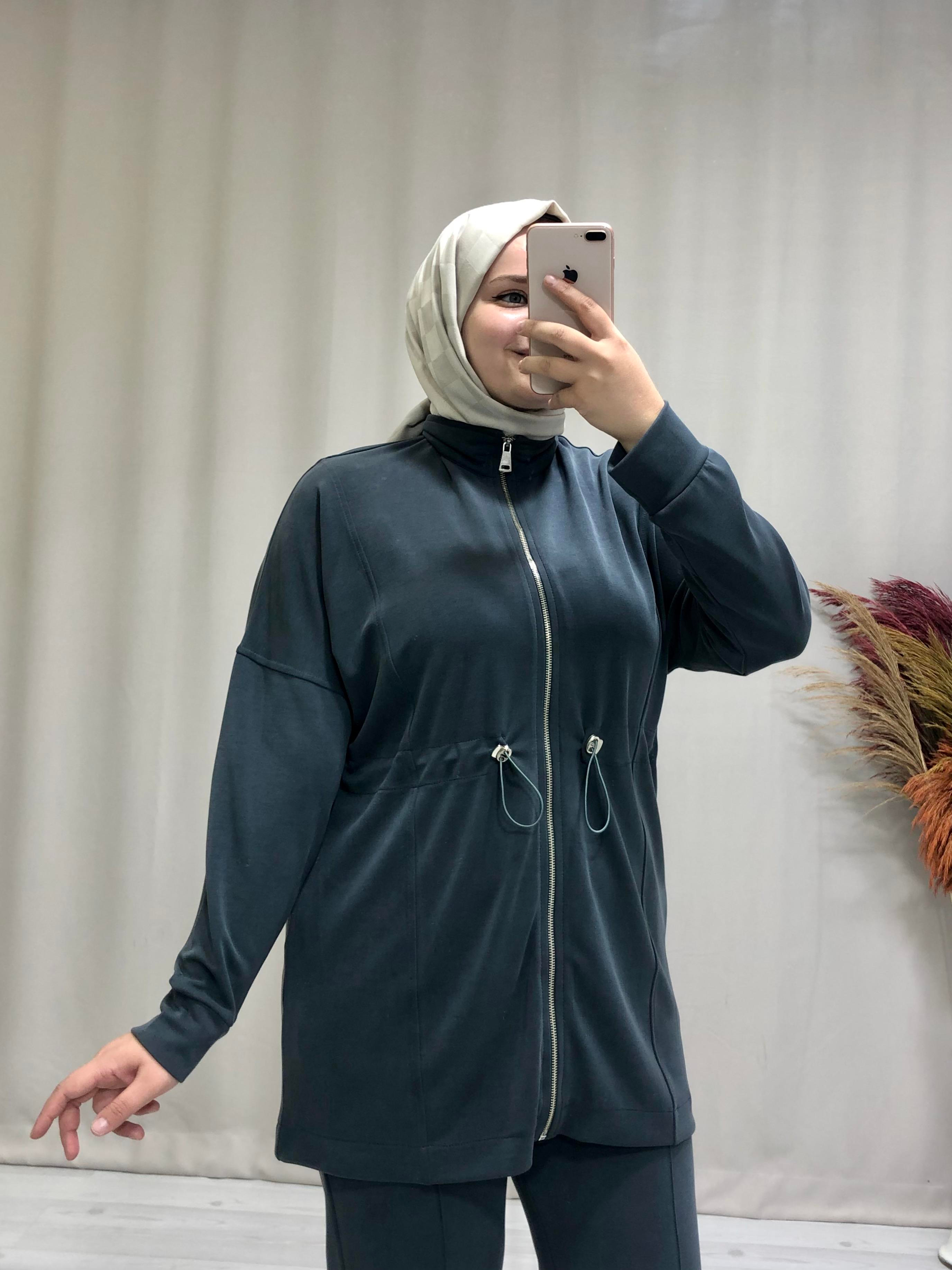 • Kadın modal kumaş tesettür  spor takım. Ürünümüz önden fermuarlı, belden ayarlanabilir büzgü detaylı, pantolonumuzun beli lastikli, dar paçadır.