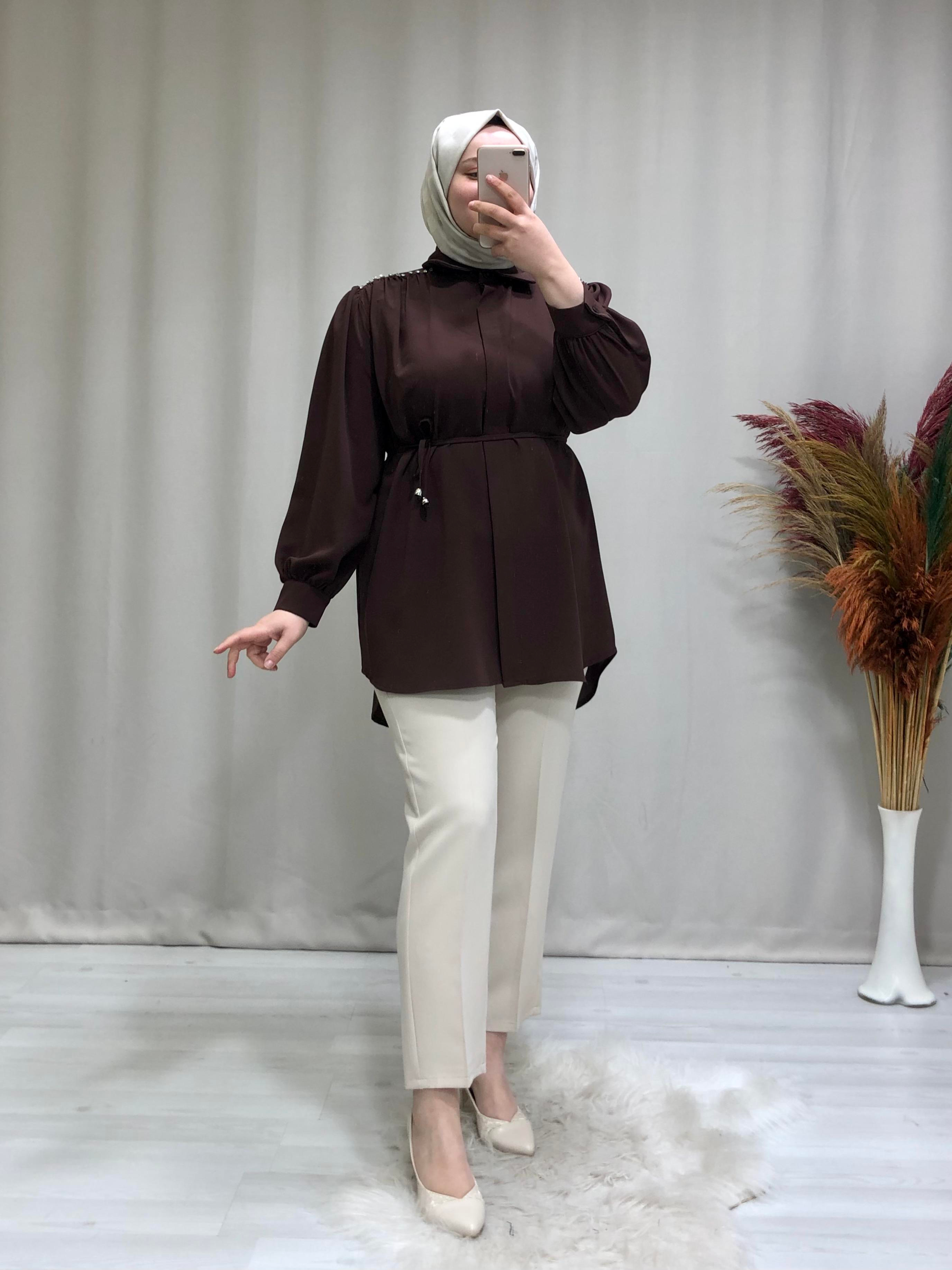 Kadın omuzu taş detaylı tesettür tunik