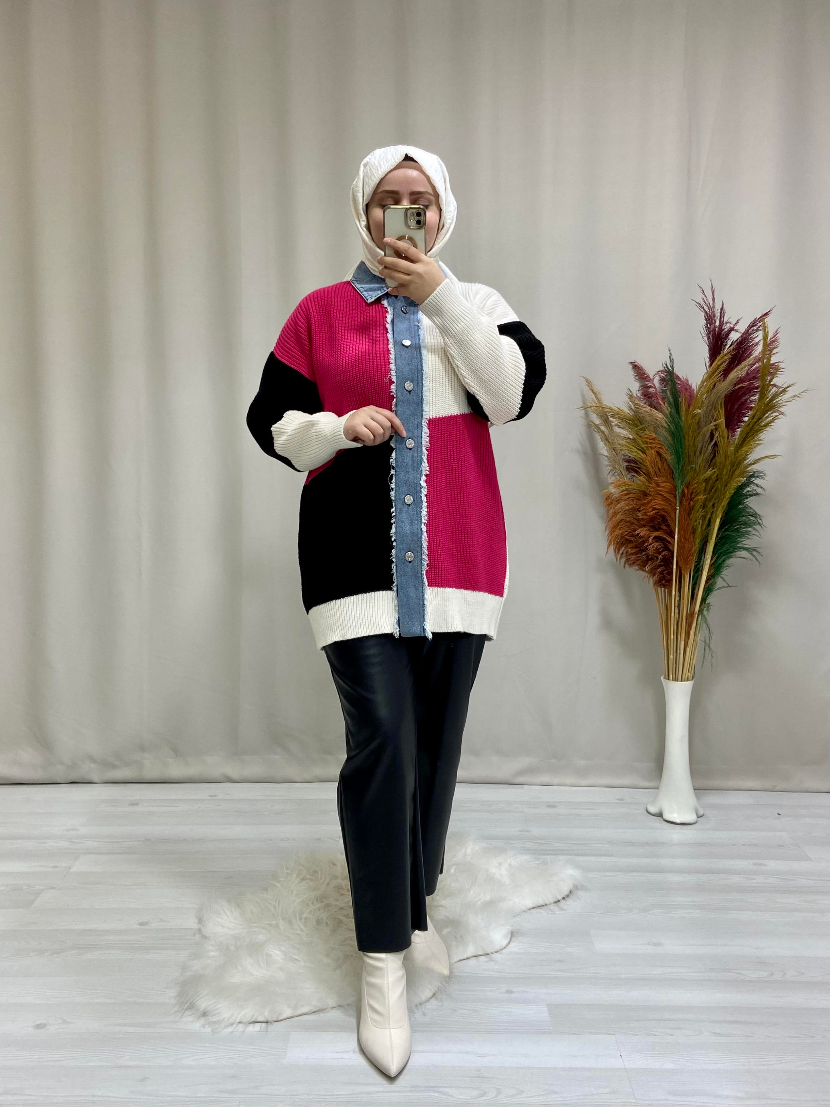 Kadın örme, triko, düğmeli, polo yaka çok renkli hırka.