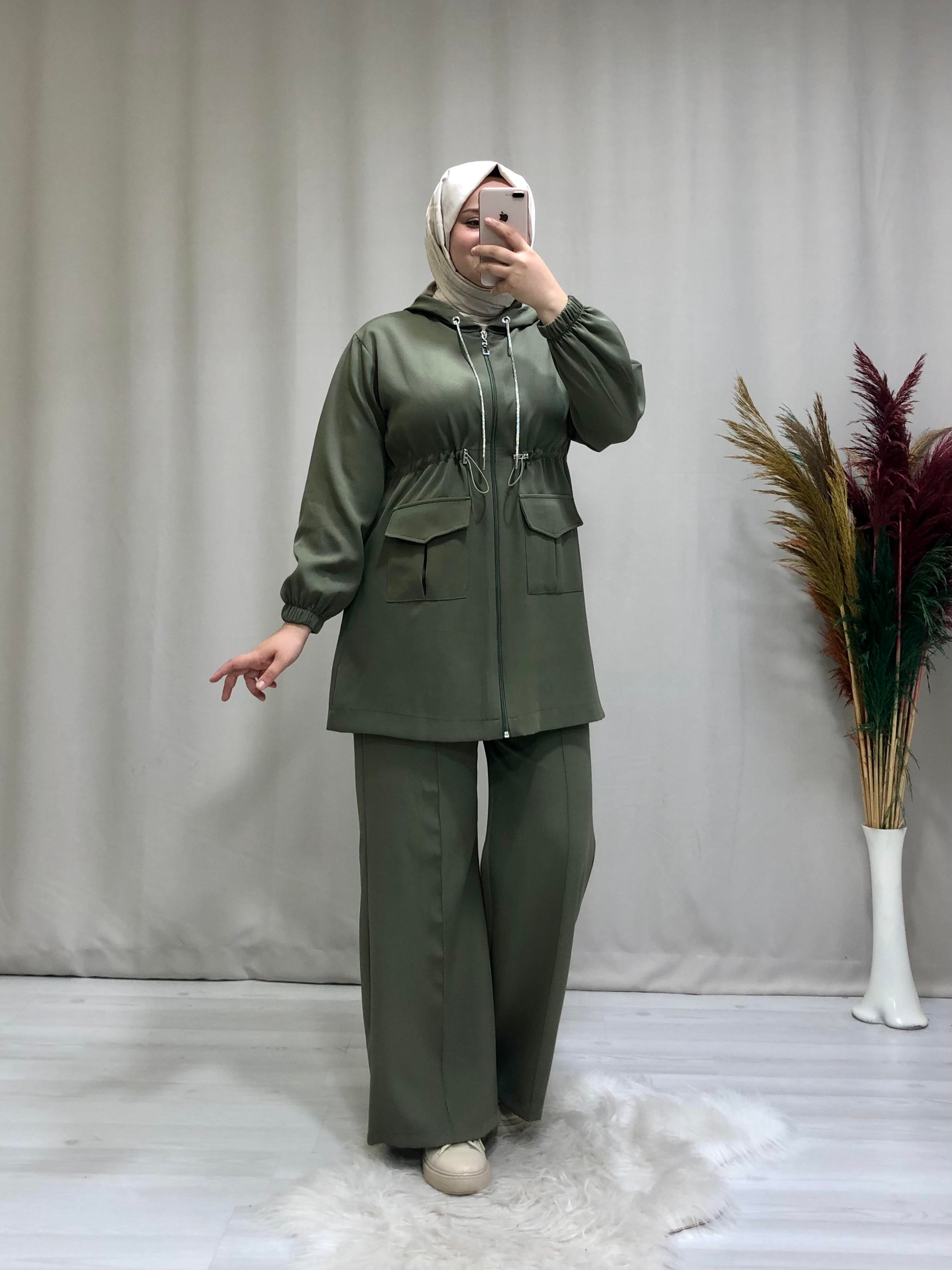 • Kadın önden fermuarlı kapüşonlu tesettür ikili takım.