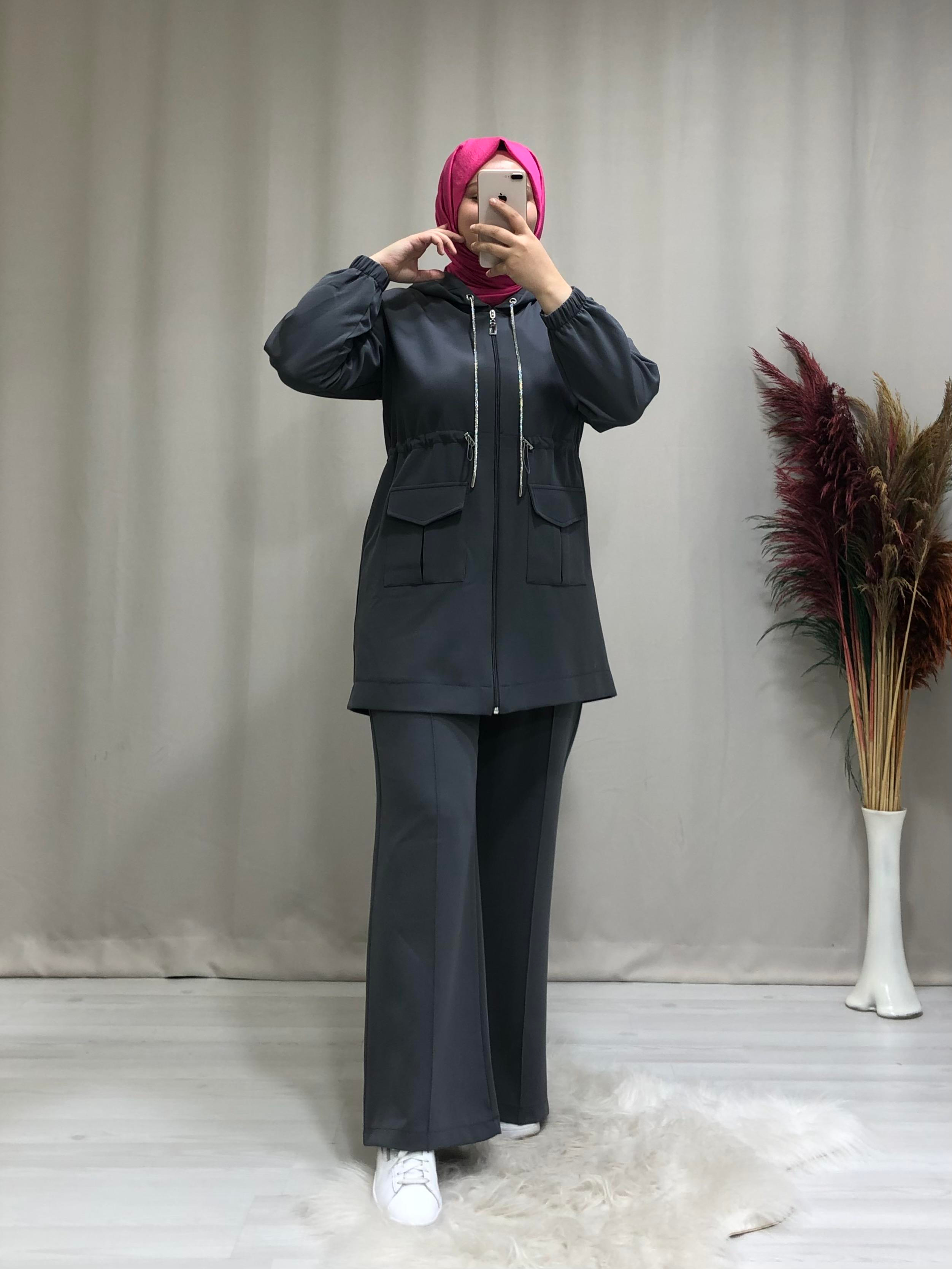 Kadın önden fermuarlı kapüşonlu tesettür ikili takım