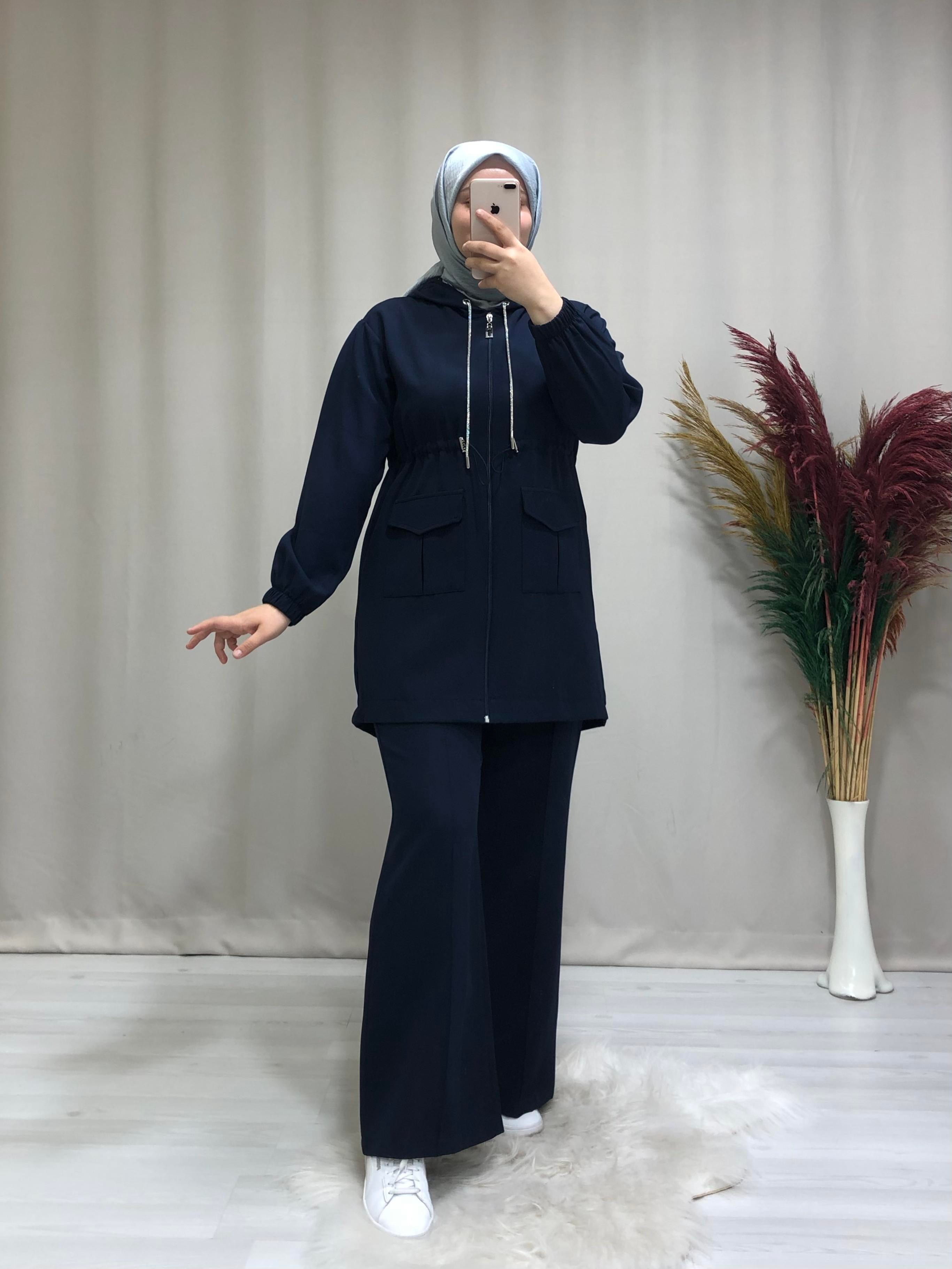 Kadın önden fermuarlı kapüşonlu tesettür ikili takım