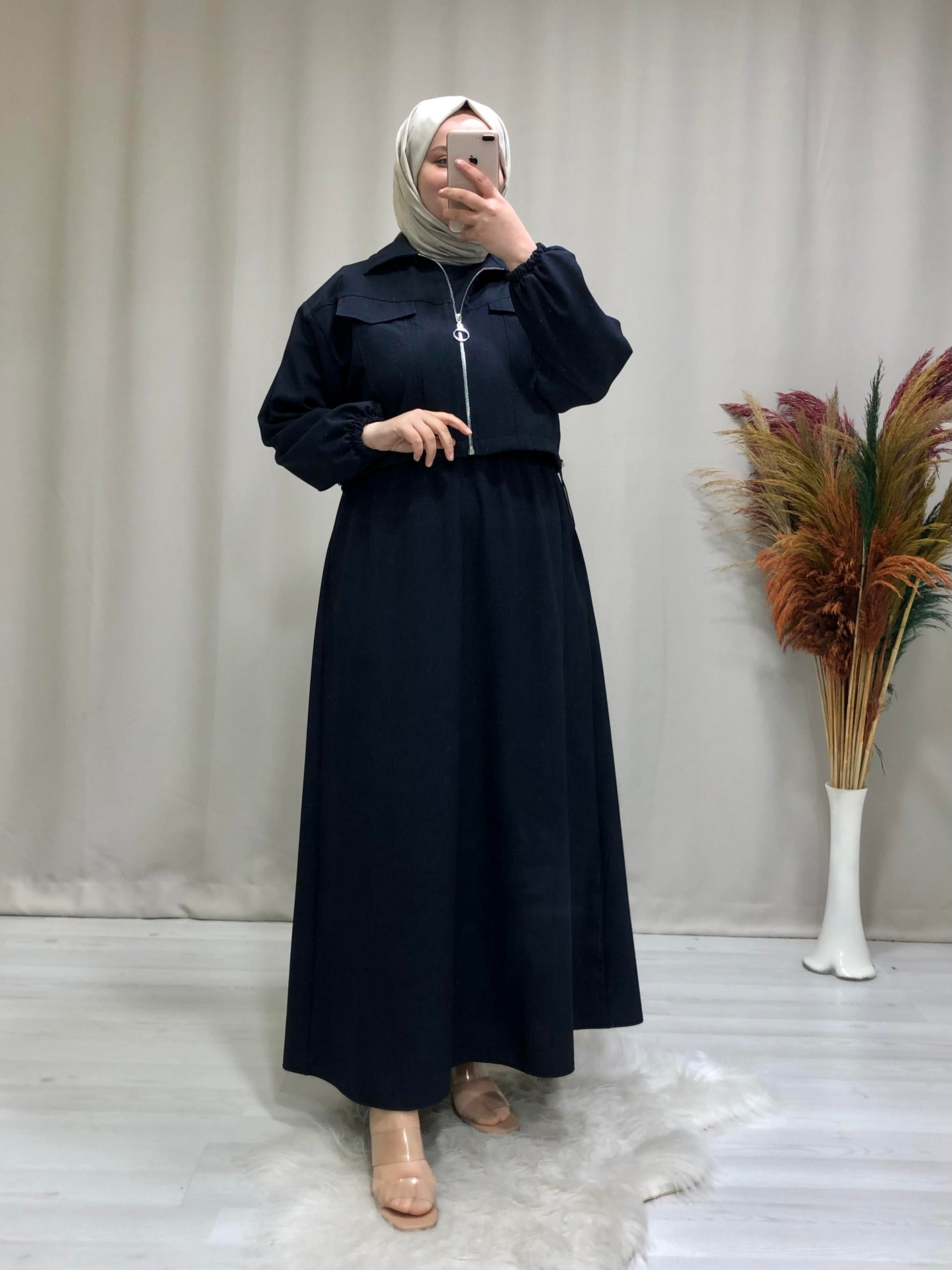 •  Ürünümüz iki parçadan oluşmaktadır, elbise iç askılı , beli lastikli, eteği kloştur, üzerinde ceketi  fermuarlı önden cep detaylıdır.