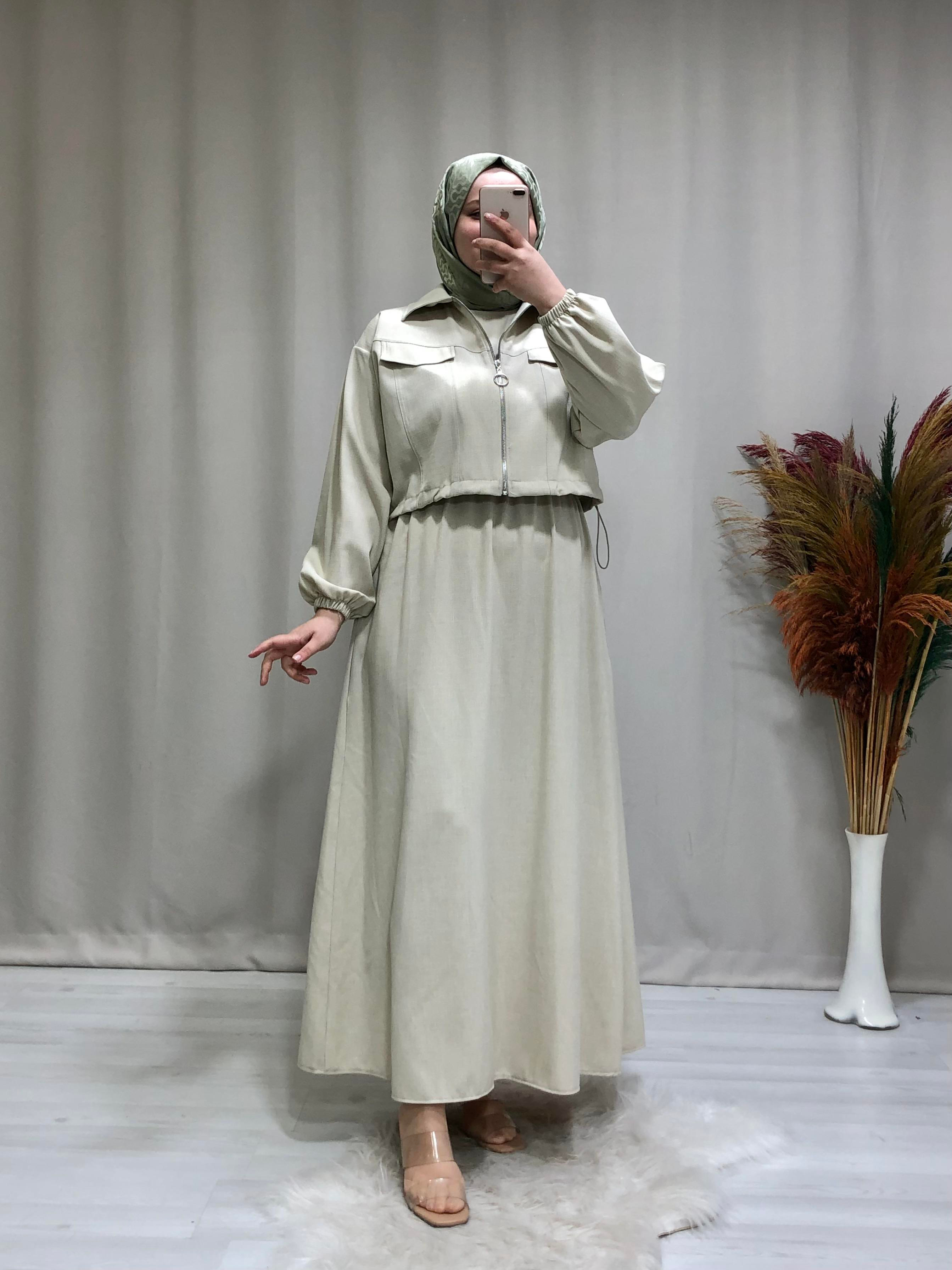 •  Ürünümüz iki parçadan oluşmaktadır, elbise iç askılı , beli lastikli, eteği kloştur, üzerinde ceketi  fermuarlı önden cep detaylıdır.