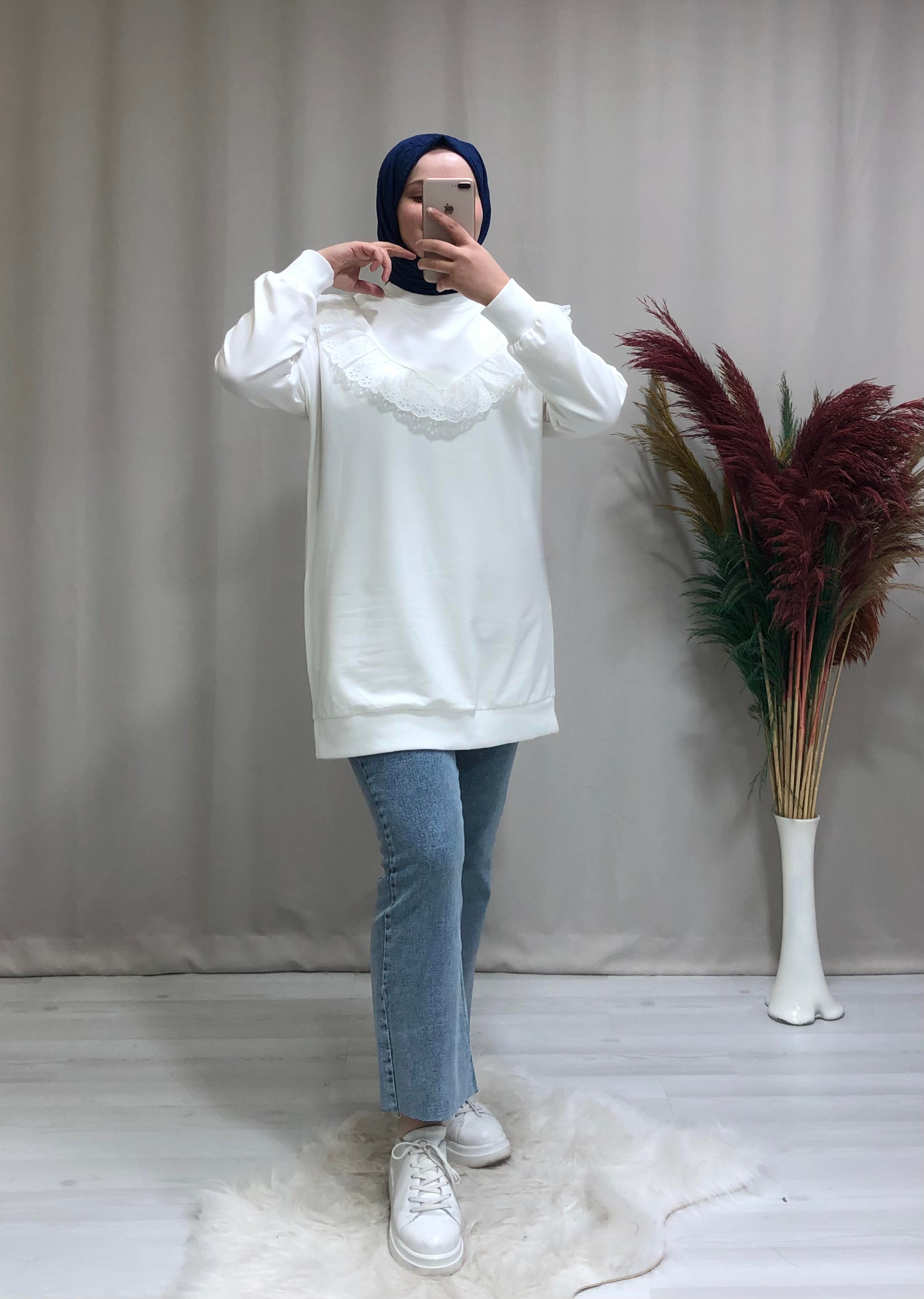 Kadın önü fırfır detaylı sweat. Ürünümüz bisiklet yaka, rahat kalıp,önden fırfır tül detaydır. 1 beden ölçüleri:( bedenler arası 2 cm oynamaktadır.) uzunluk:83cm göğüs:60cm basen:56