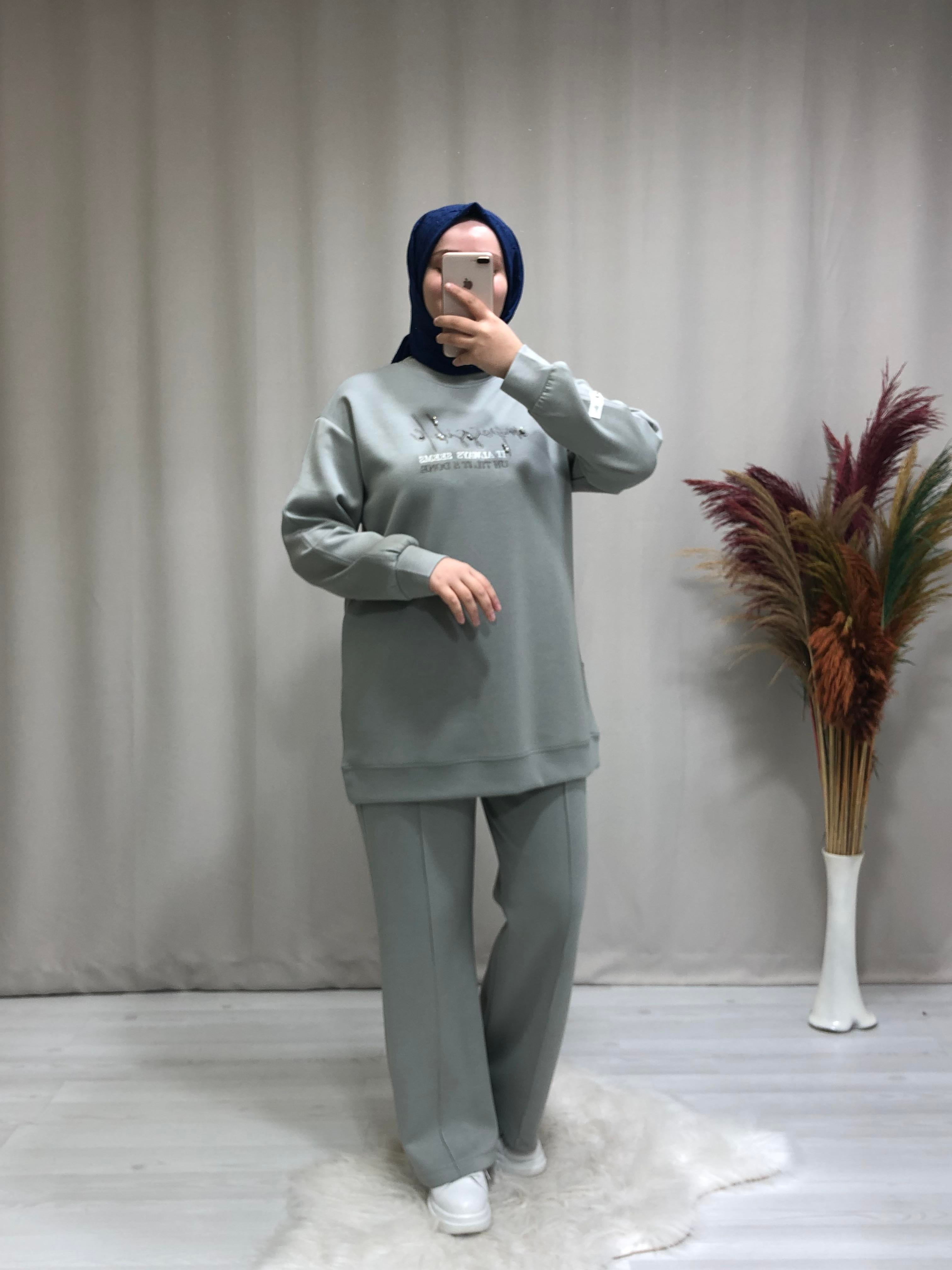 Kadın Önü yazı Detaylı Tesettür Eşofman Takımı. Ürünümüz 2 iplik şardonsudur. 4 bedenden oluşmaktadır.