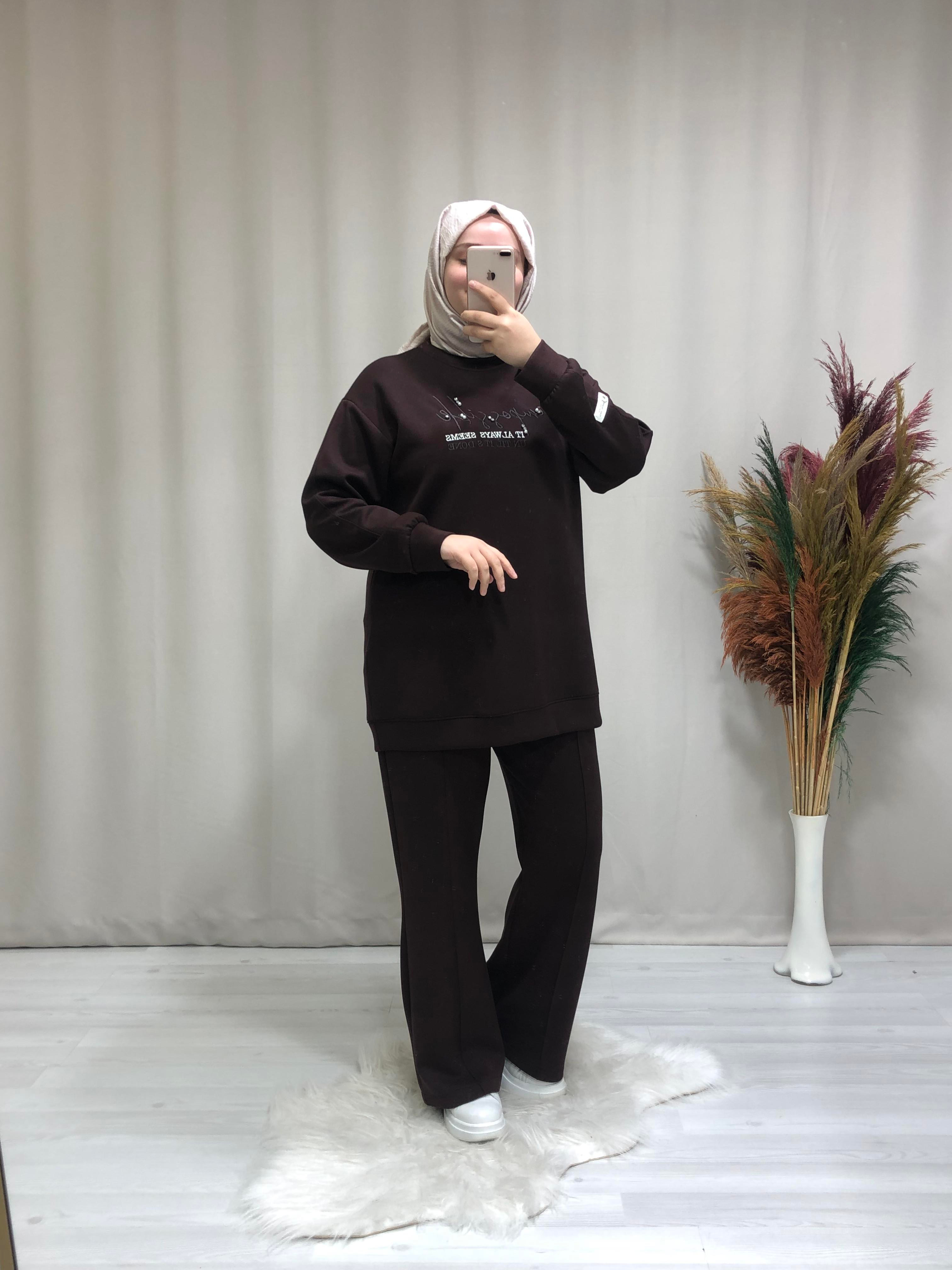 Kadın Önü yazı Detaylı Tesettür Eşofman Takımı. Ürünümüz 2 iplik şardonsudur. 4 bedenden oluşmaktadır.