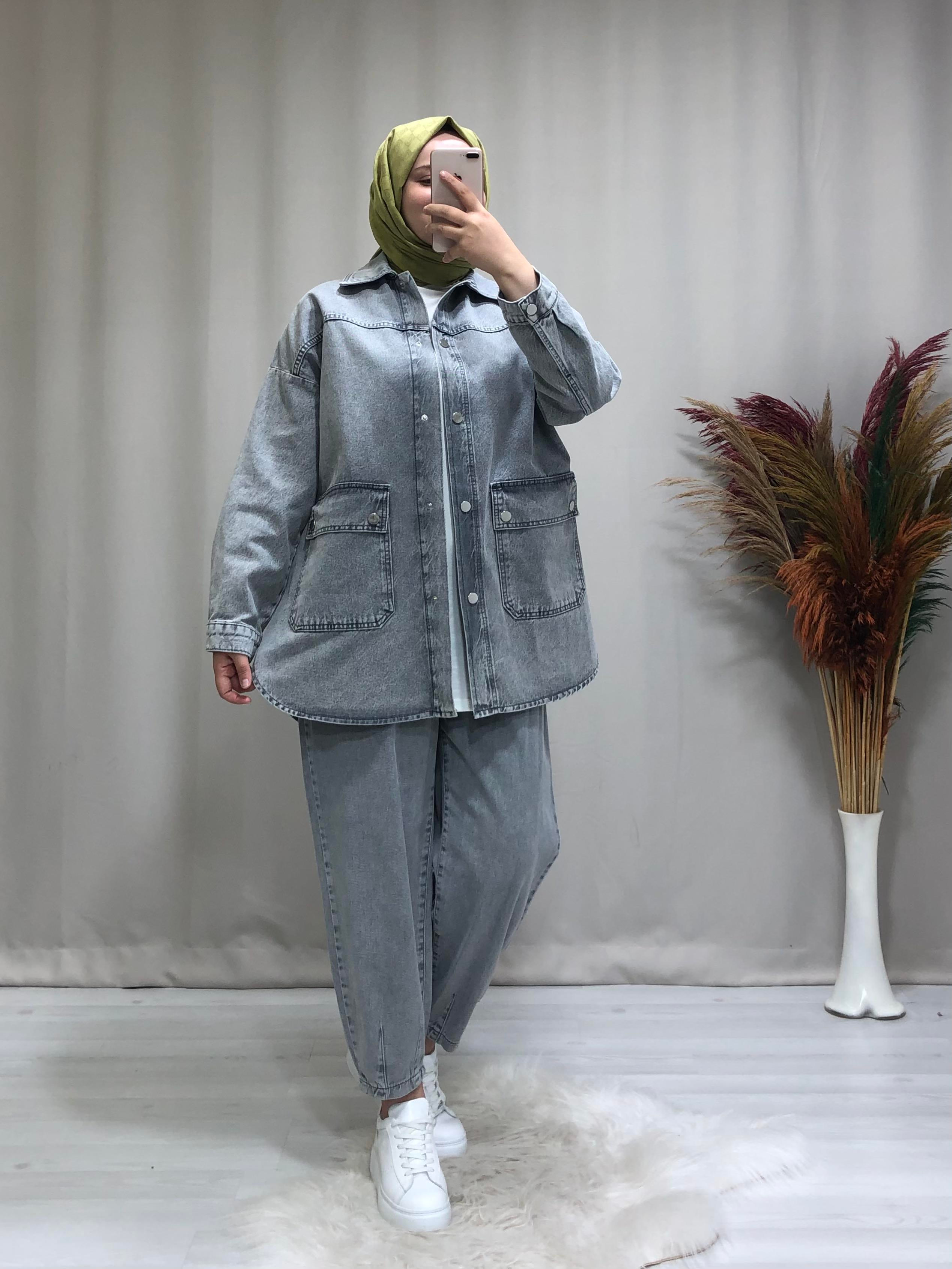 • Kadın oversize kalıp tesettür kot ceket. Ürünümüz önden çıt çıt kapamalı, gömlek yaka , standart