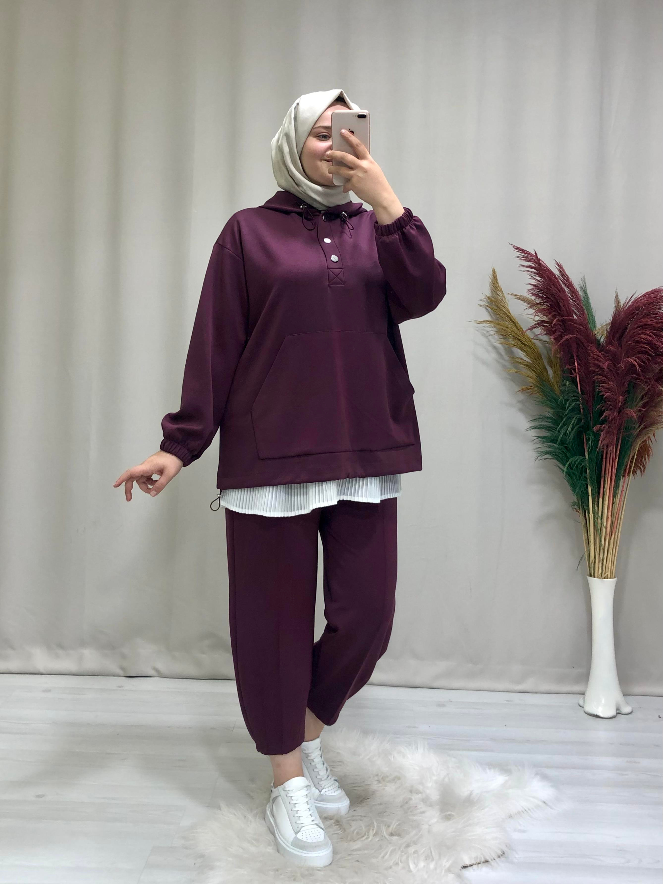 • Kadın oysh kumaş tesettür spor ikili  takım. Ürünümüz kapüşonlu,önden çıt çıt kapamalı, tunik alt kısmı ayarlanabilir lastikli,kanguru ceplidir.
