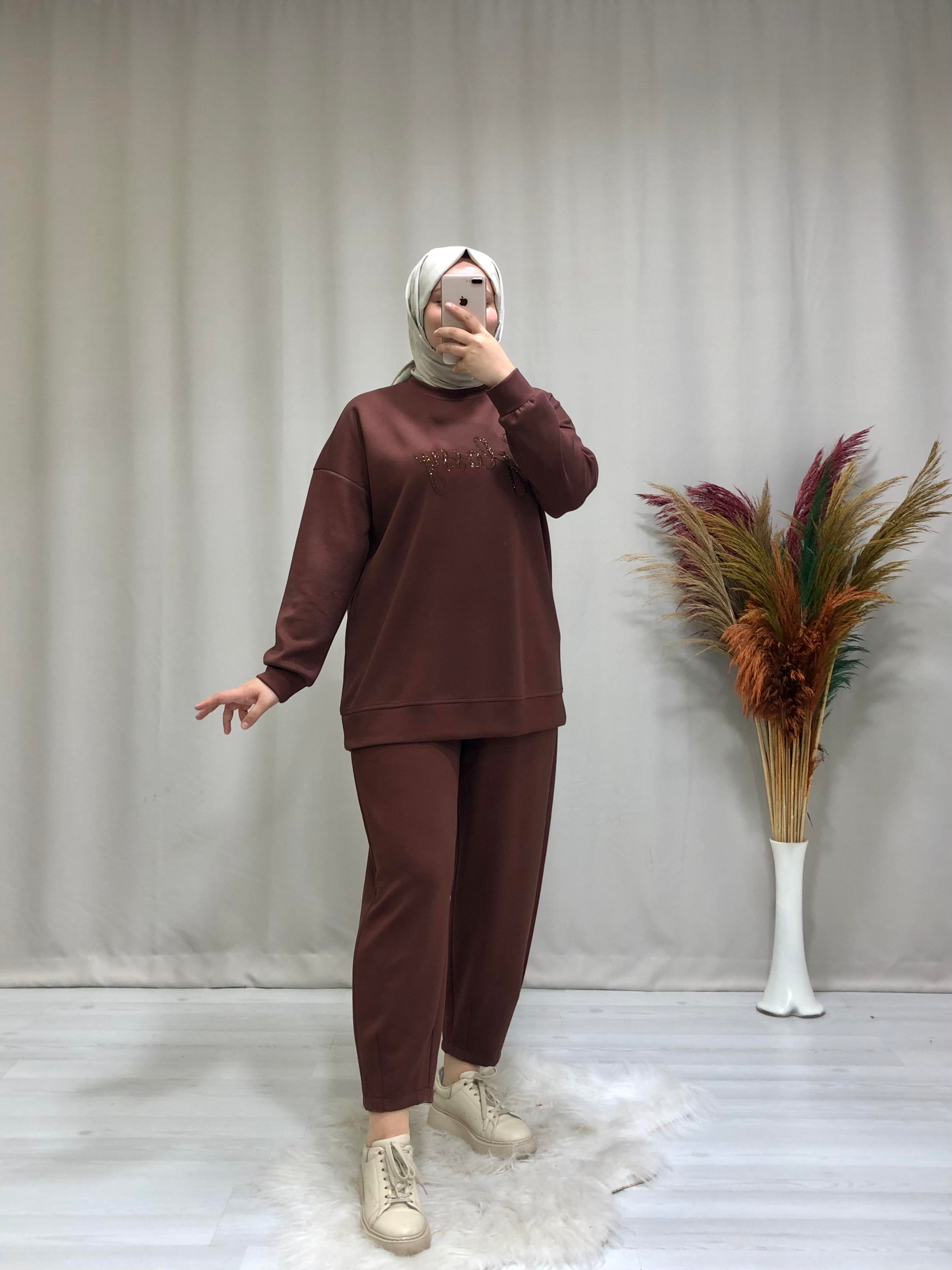 Kadın oysho kumaş nakış ve taş yazılı spor takım