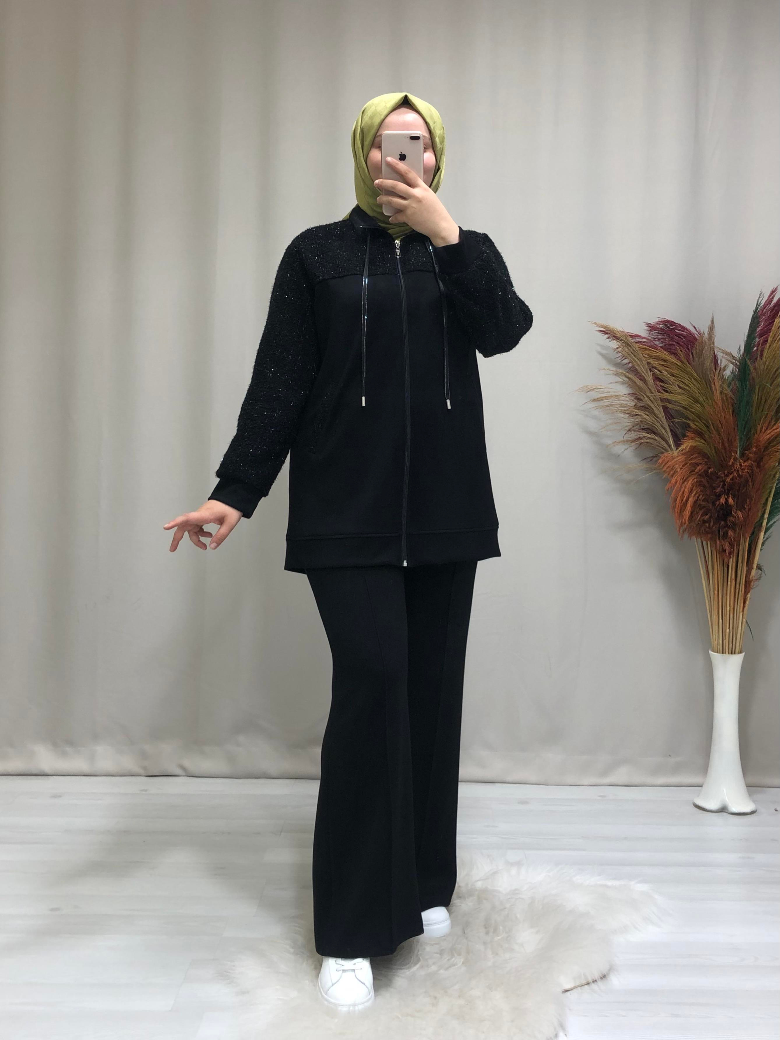 • Kadın oysho kumaş spor ikili tesettür takım. Ürünümüz önden fermuarlı, kolları sim detaylı ,cepli'dir.