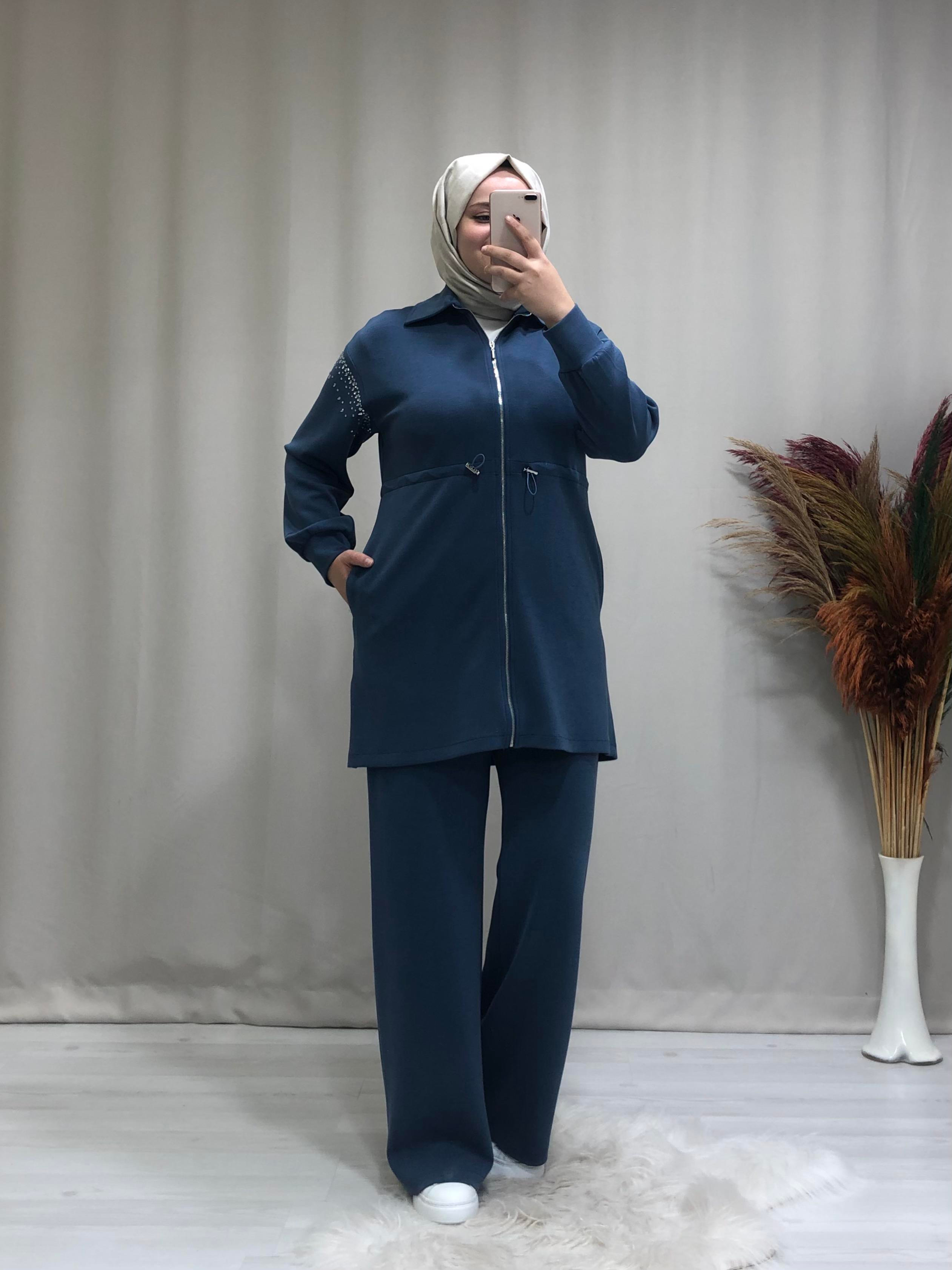Kadın oysho kumaş taş detaylı tesettür takım. Ürünümüz önden fermuarlı, gömlek yaka, belden ayarlanabilir büzgü detaylı, kollarında taş işlemeleri bulunmaktadır.