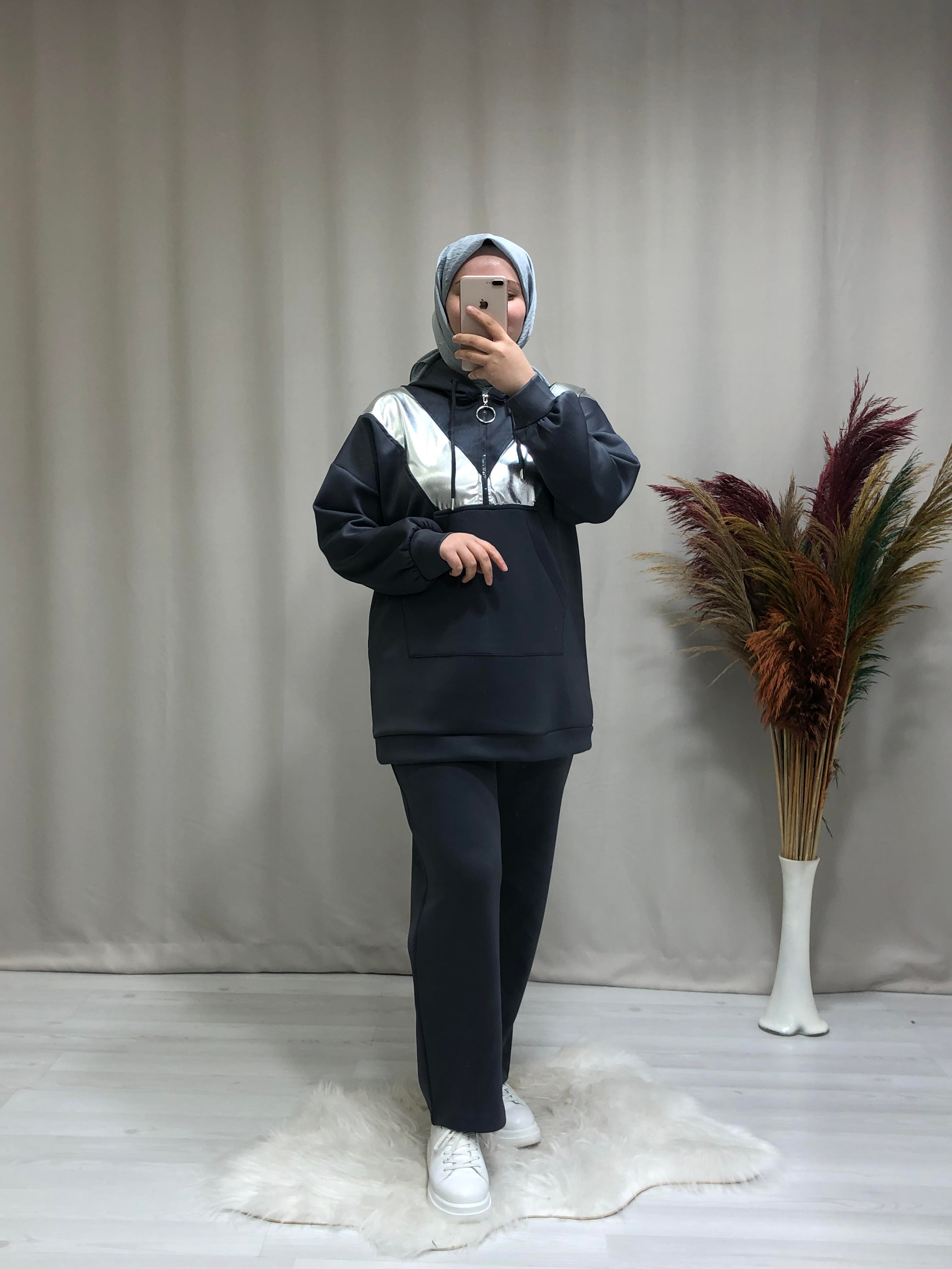 Kadın Reflektör Detaylı Kanguru Model Kapüşonlu Tesettür Eşofman Takımı. Ürünümüz s-m ve l-xl beden'dir.