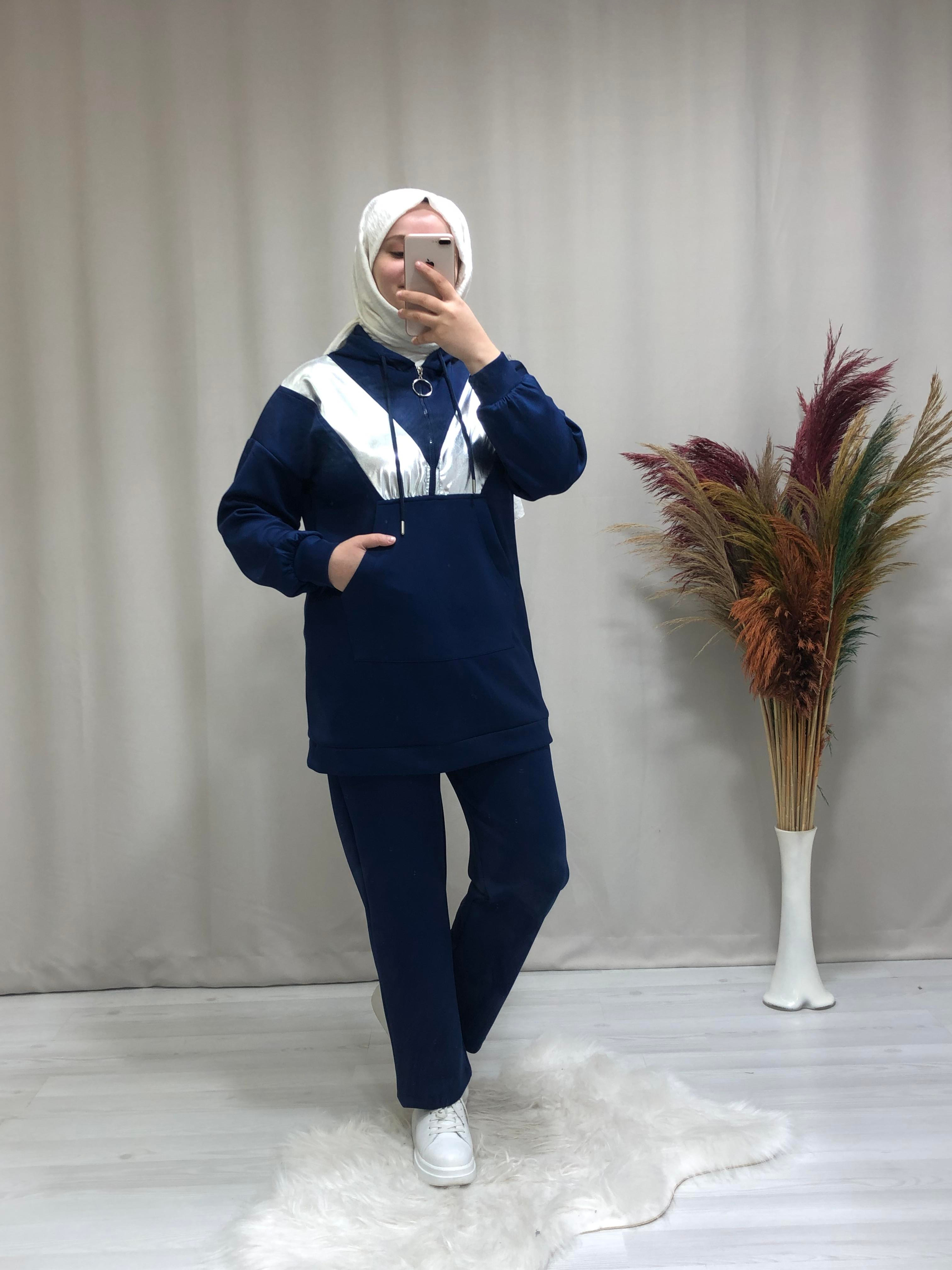 Kadın Reflektör Detaylı Kanguru Model Kapüşonlu Tesettür Eşofman Takımı. Ürünümüz s-m ve l-xl beden'dir.